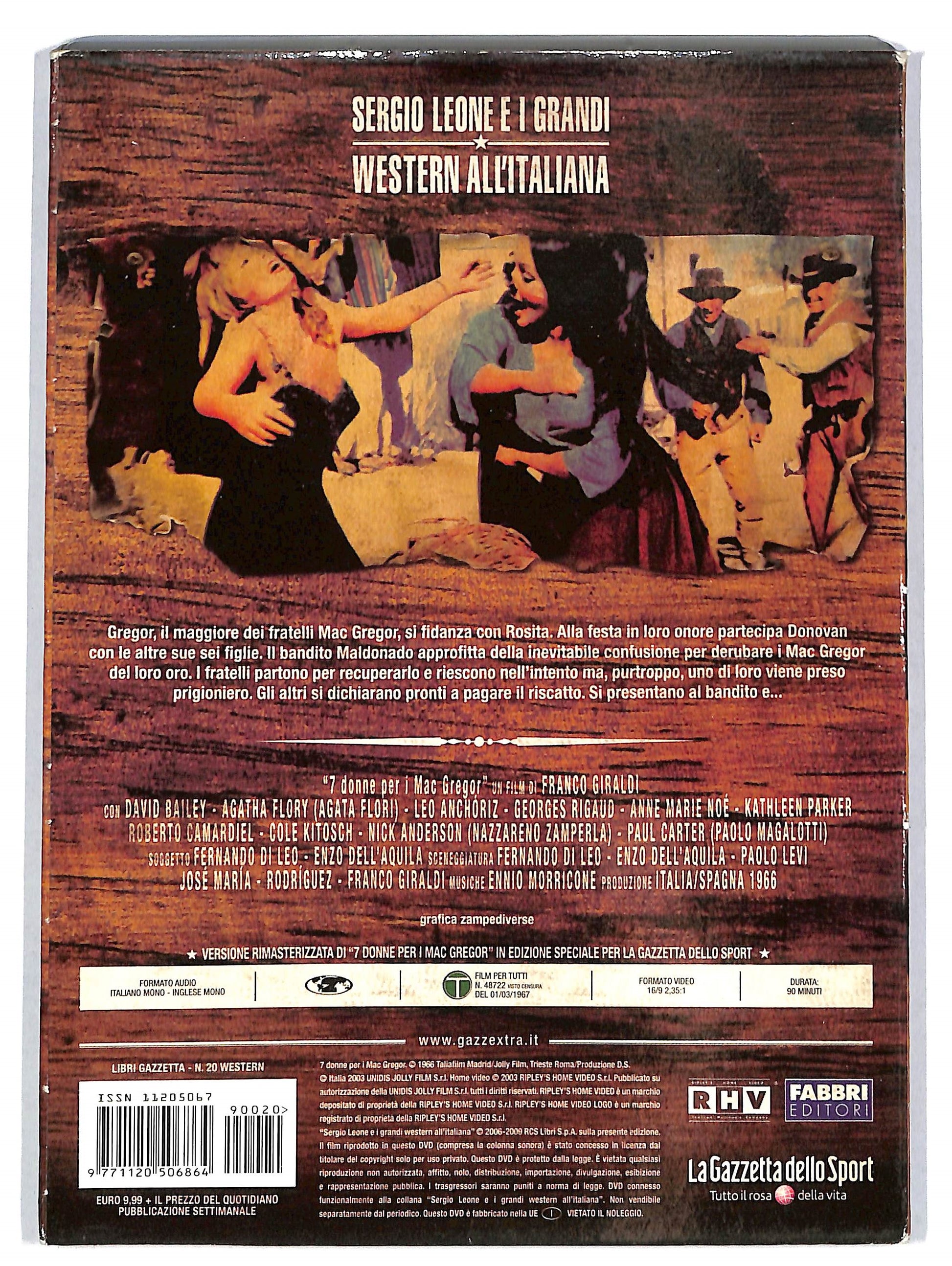 7 donne per i MacGregor Lingua originale italiano, spagnolo Paese di produzione Spagna, Italia Anno 1967 Durata 90 minuti Rapporto 2.35:1 Genere western, commedia Regia Franco Giraldi Soggetto Enzo Dell'Aquila, Fernando Di Leo Sceneggiatura Enzo Dell'Aquila, Fernando Di Leo, Franco Giraldi, Paolo Levi, Jose Maria Rodriguez Produttore Dario Sabatello Casa di produzione Jolly Film, Produzione D.S., Talia Films (non accreditata) Distribuzione in italiano Unidis Fotografia Alexander Ulloa Montaggio Nino Baragli Effetti speciali Celeste Battistelli Musiche Ennio Morricone (dirette da Bruno Nicolai) Scenografia Ottavio Scotti, Adolfo Cofino Costumi Italia Scandariato Trucco Amato Garbini Interpreti e personaggi David Bailey: Gregor MacGregor Agatha Flory: Rosita Carson Leo Anchoriz: Maldonado George Rigaud: Alastair MacGregor Francesco Tensi[1]: Harold MacGregor Anne Marie Noe: Mamie MacGregor Margaret Horovitz: Annie MacGregor Caterina Trentini[2]: Belfast Donovan Ana Maria Mendoza: Kilkenny Donovan Julie Fair: Galway Donovan Judith Shepard: Dundalks Donovan Ana Casares: Dolly Margaret Merrit: Dublin Donovan Fernanda Dell'Acqua[3]: Tralee Donovan Alberto Dell'Acqua[4]: Dick MacGregor Nazzareno Zamperla[5]: Peter MacGregor Paolo Magalotti[6]: Kenneth MacGregor Saturnino Cerra: Johnny MacGregor Julio Perez Tabernero: Mark MacGregor Hugo Blanco: David MacGregor Victor Israel: Trevor Roberto Camardiel: Pa Donovan Tito Garcia: Miguel Antonio Vico: Frank James Nino Scarciofolo: primo bandito Riccardo Pizzuti: secondo bandito Rinaldo Zamperla: terzo bandito Alberto Cevenini: quarto bandito Doppiatori italiani Pino Locchi: Gregor MacGregor Melina Martello: Rosita Carson Glauco Onorato: Maldonado Bruno Persa: Alastair MacGregor Lauro Gazzolo: Harold MacGregor Franca Dominici: Mamie MacGregor Lydia Simoneschi: Annie MacGregor Rita Savagnone: Dolly Massimo Turci: Dick MacGregor Cesare Barbetti: Peter MacGregor Renato Turi: Kenneth MacGregor Sergio Tedesco: Johnny MacGregor Luciano De Ambrosis: Mark MacGregor Sergio Graziani: David MacGregor Ferruccio Amendola: Trevor il cavadenti Carlo Romano: Pa Donovan Manlio Busoni: Miguel Oreste Lionello: Frank James