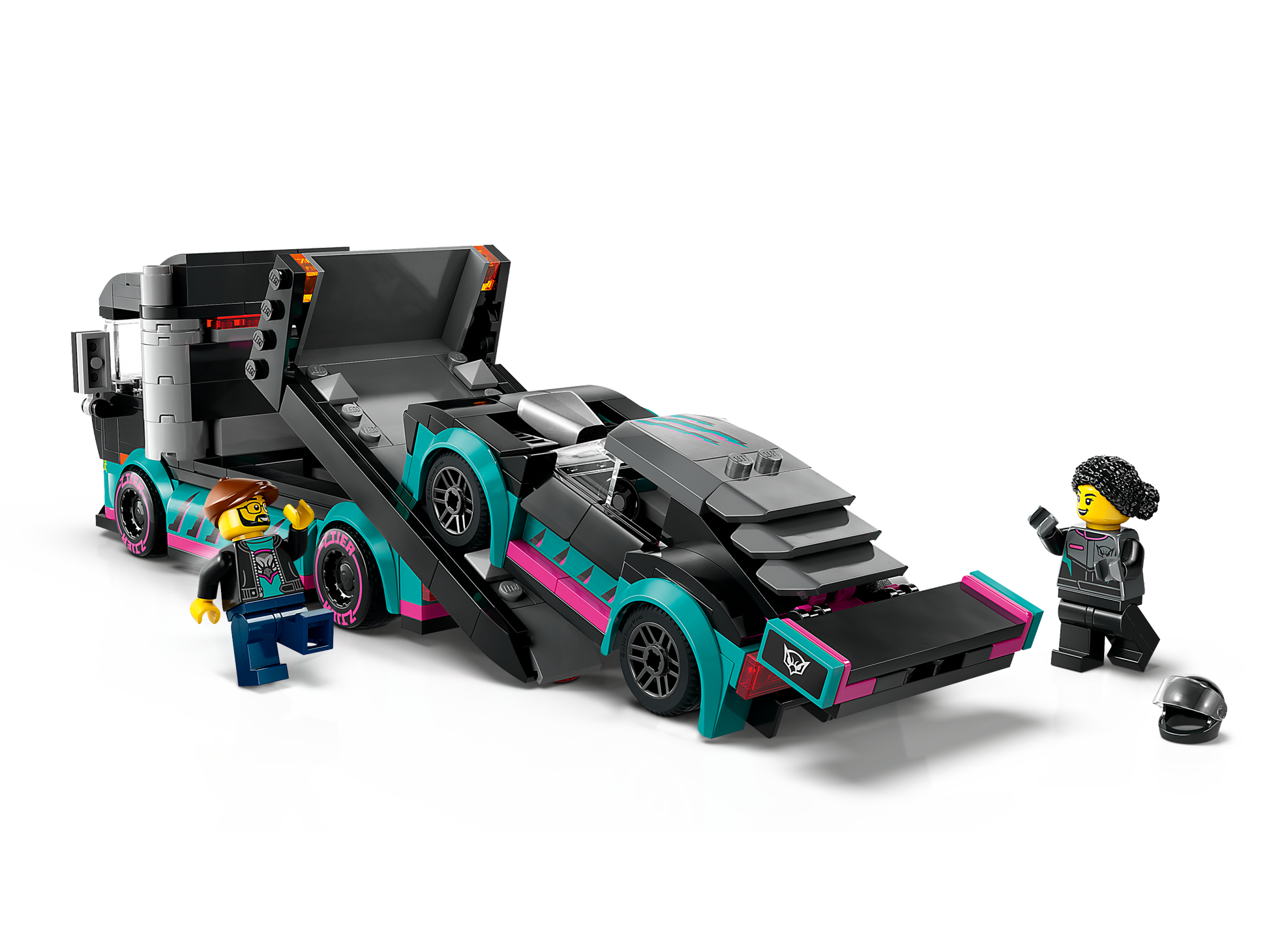 - Modello di trasportatore LEGO®: i bambini possono abbassare la rampa del camion per caricare l'auto da corsa giocattolo prima di dirigersi alla pista più vicina per emozionanti gare tra camion e auto