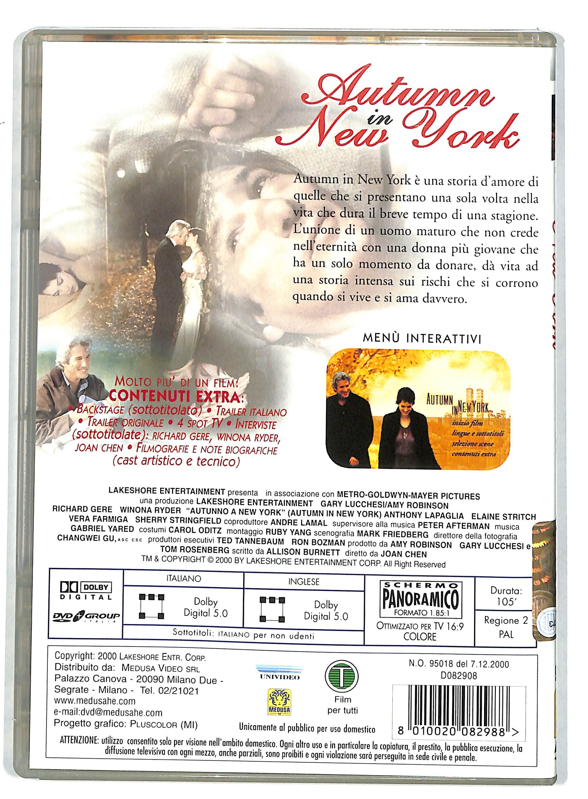 Autumn in New York Lingua italiano, inglese Sottotitoli italiano per non udenti Titolo originale Autumn in New York Paese di produzione Stati Uniti d'America Anno 2000 Durata 103 min Genere drammatico, sentimentale Regia Joan Chen Sceneggiatura Allison Burnett Distribuzione in italiano Medusa Distribuzione Fotografia Changwei Gu Montaggio Ruby Yang Musiche Gabriel Yared Scenografia Mark Friedberg Interpreti e personaggi Richard Gere: Will Keane Winona Ryder: Charlotte Fielding Anthony LaPaglia: John Elaine Stritch: Dolls Vera Farmiga: Lisa Tyler Sherry Stringfield: Sarah Jill Hennessy: Lynn McCall J. K. Simmons: Dr. Tom Grany Sam Trammell: Simon Mary Beth Hurt: dott.ssa Sibley Kali Rocha: Shannon Steven Randazzo: Alberto George Spielvogel III: Netto Ranjit Chowdhry: Fakir Audrey Quock: Eriko Doppiatori italiani Mario Cordova: Will Keane Ilaria Stagni: Charlotte Fielding Pasquale Anselmo: John Marzia Ubaldi: Dolls Emanuela Rossi: Lisa Tyler Claudia Razzi: Sarah Franco Zucca: Dr. Tom Grandy Francesco Pezzulli: Simon Fabrizia Castagnoli: dott.ssa Sibley Marcello Santoni: Fakir Raffaella Castelli: Eriko Attori: Richard Gere, Winona Ryder, Anthony LaPaglia, Elaine Stritch, Vera Farmiga, Sherry Stringfield, Jill Hennessy, J. K. Simmons, Sam Trammell, Mary Beth Hurt, Kali Rocha, Steven Randazzo, George Spielvogel III, Ranjit Chowdhry, Audrey Quock Tipo: Dvd Genere: Drammatico Codice regionale: Dvd 2 (eur, Jpn, M East) Formato: Dvd Regista: Joan Chen Formato: DVD Durata: 103 minuti Anno di pubblicazione=2000
