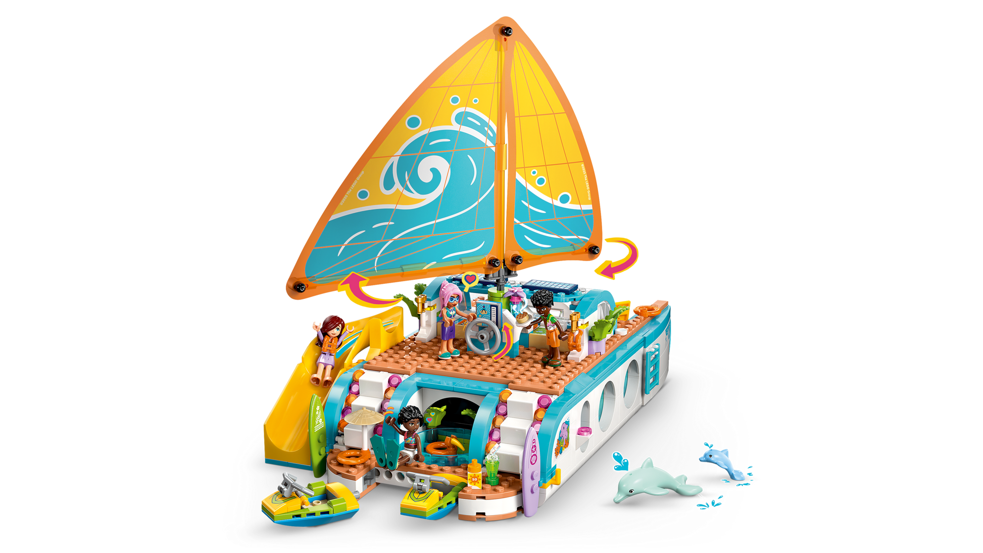 - Un set da gioco con barca e tantissime funzionalità: i bambini possono costruire il catamarano, quindi divertirsi a creare le loro storie per i personaggi mentre gli amici giocano e si rilassano sulla barca e avvistano i delfini
