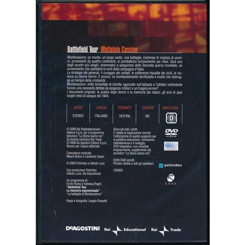 Battlefield Tour - Mattatoio Cassino . . Montecassino: un monte, un luogo santo. una battaglia. . Centinaia di migliaia di uomi ni, provenienti da quattro continenti, si combattono furiosamente per mesi. Sara uno degli scontri piu lunghi, drammatici e sanguinosi della Seconda guerra mondiale, un avvenimento che cambiera le sorti della campagna d'ltalia. . Le strategie dei generali, il coraggio dei soldati, le sofferenze inaudite dei civili, le violenze su donne inermi. E ancora, un bombardamento terrificante e inutile che distrugge un tempio della cristianita. . Montecassino: mille tonnellate di bombe sganciate sull'abbazia e l'abitato sottostante furono una necessita dettata da esigenze militari o un tragico errore? . I documenti originali, le analisi degli storici e la memoria dei reduci, gli eroi di quei lunghi mesi di sangue del 1944.. . . FORMATO VIDEO: 16:9 PAL. . FORMATO AUDIO: italiano stereo. . DURATA: 70 minuti ca. . . AREA CODE: 0. . DOCUMENTARI: RAI 2008 - Polivideo e Istituto Luce 2003