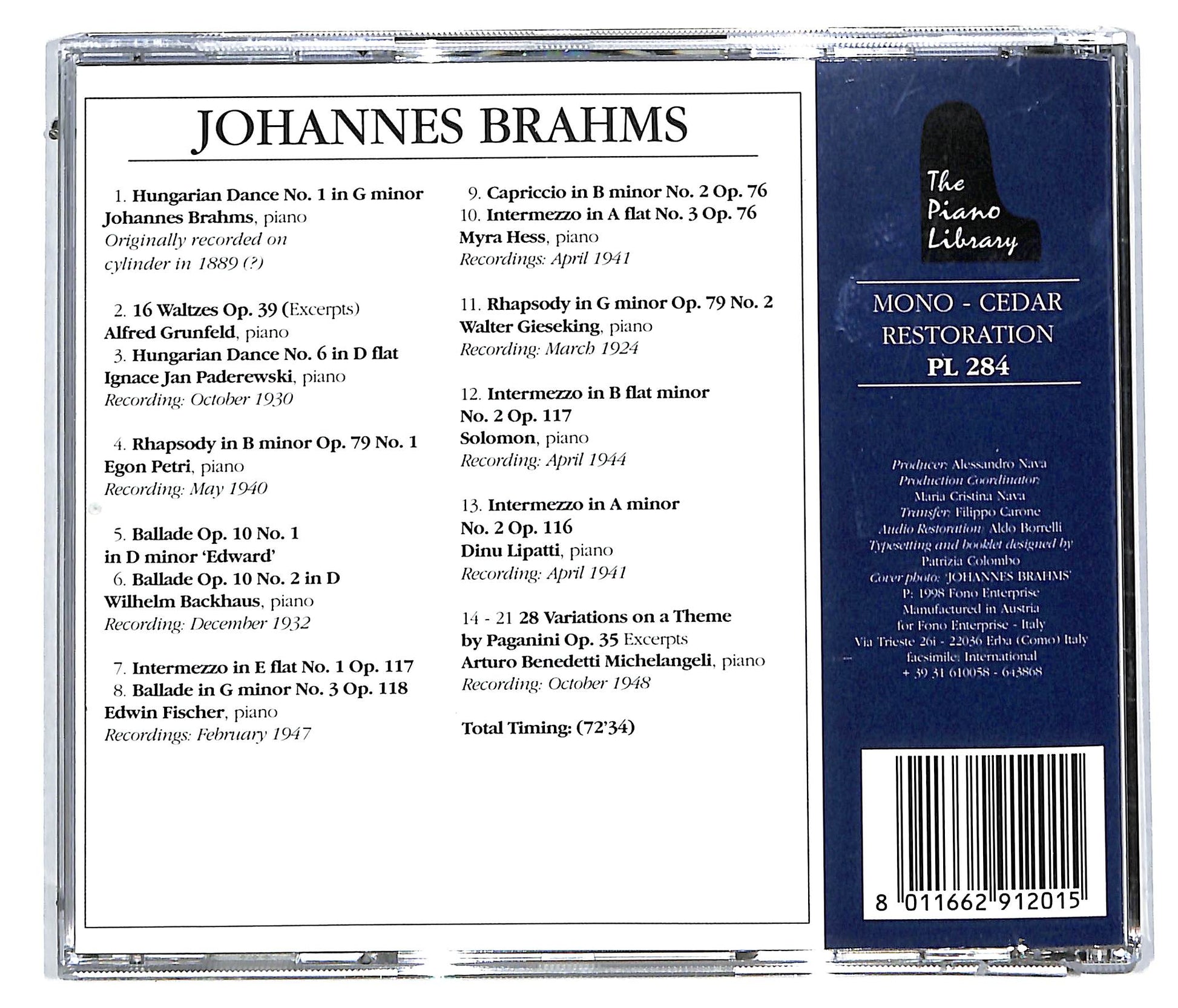 Brahms Plays Brahms - Grunfeld , Paderewski , Backhaus , Fischer , Gieseking , Hess , Lipatti , Petri , Michelangeli , Solomon - Great Pianists Play Brahms