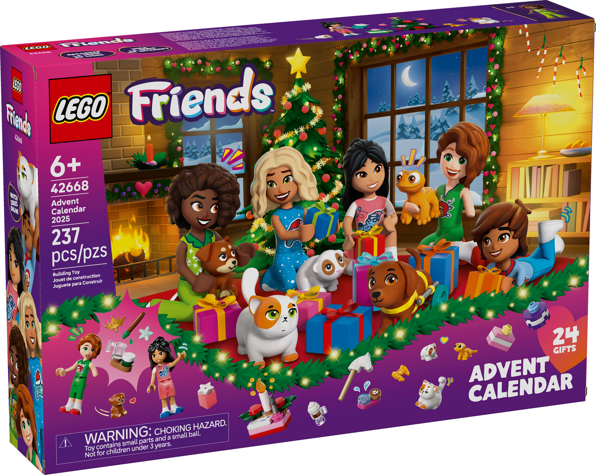 Ispira l'allegria natalizia e momenti di amicizia mentre i bambini dai 6 anni in su aprono le porticine del set giocattolo Calendario dell'Avvento 2025 LEGO® Friends (42668). Contiene 5 mini-doll, tra cui Aliya, Autumn, Liann, Nova e Leo, più 5 animali LEGO tra cui 2 cani, un porcellino d'India, un geco e un gatto.Apri una porticina ogni giorno per costruire la storia del pigiama party natalizio. Trova sorpresine dietro ogni porticina con dolci modelli natalizi da realizzare. Scopri attività festive come scrivere a Babbo Natale, decorare l'albero, cantare al karaoke, cavalcare il cavallo a dondolo e preparare la cioccolata calda. Ogni mini-doll ha un materasso e ogni animale domestico è dotato di accessori in modo che i bambini possano creare storie diverse mentre assemblano la scena. Altri divertenti accessori includono un divano, una lampada, un caminetto, una slitta, 5 scatole regalo e una renna di peluche LEGO.Oltre a essere un vero e proprio conto alla rovescia fino alle feste per i bambini, questo giocattolo creativo supporta le abilità sociali dei giovani costruttori mentre si ritrovano con gli amici per un pigiama party indimenticabile.