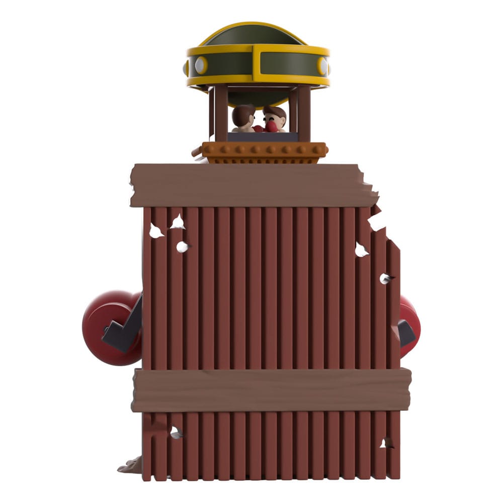Your weapons aren't the only things that you should upgrade, so grab a piping-hot brew to power up your fists too! At 5 inches tall and standing in front of a run-down metal wall riddled with bullet holes, a green and gold wrestling belt that says 'Melee Macchiato' sits at its top above two small figures who are in a boxing match. With its body made of a deluxe brown wood with elegant trimming and a bronze bell at its center above a hatched yellow window, two long mechanical arms extend from its sides and wear a pair of large red boxing gloves. The exterior of its packaging sees the machine sitting alone in a desolate warehouse with metal drawers on the wall. The interior is engulfed in black 'redacted' bars which work their way onto the protective sleeve where this figure can be seen through the large clear window at the packaging's front. This collectible ships in a matte, embossed, protective outer sleeve and a custom-sized plastic protector for maximum protection during shipping.