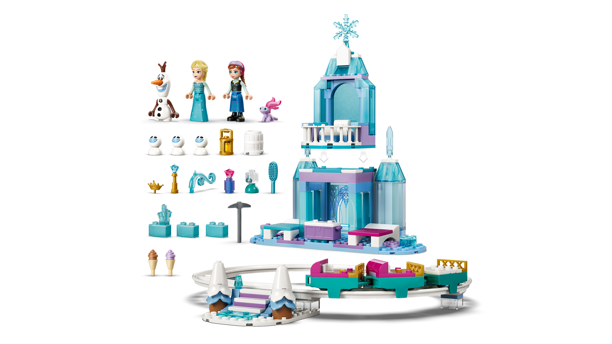 - CASTELLO CON BINARIO E SLITTA: questo set da costruzione giocattolo Castello di ghiaccio di Elsa e avventura sulla neve (43281) contiene 7 personaggi LEGO® ? Disney Frozen, un castello a 2 livelli, un binario per la slitta, scale e altro ancora