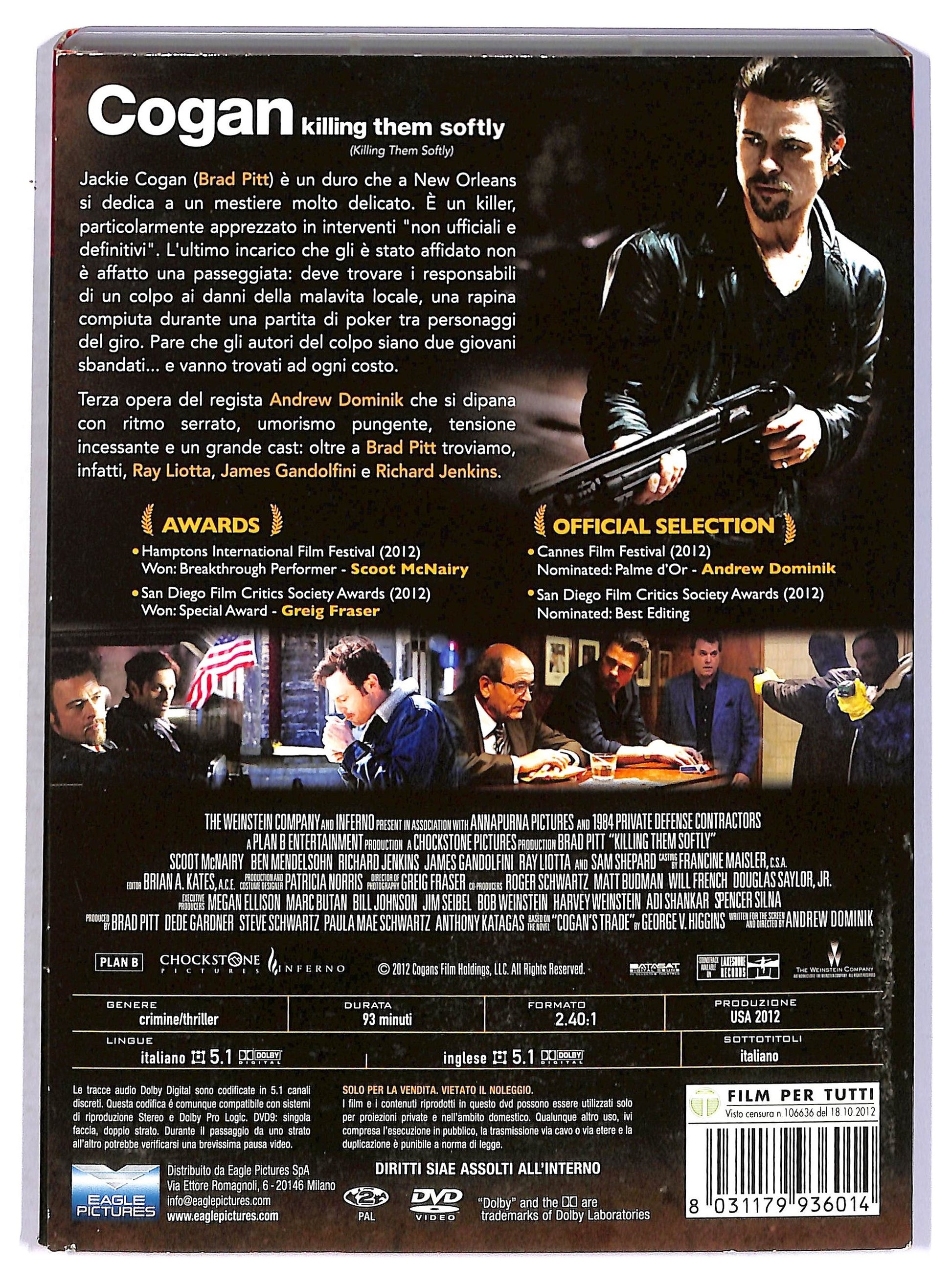 Genere: Gangster, Noir, Thriller, Drammatico Regia Andrew Dominik Soggetto Dal Romanzo Cogan Di George V. Higgins Sceneggiatura Andrew Dominik Produttore Brad Pitt, Dede Gardner, Steve Schwartz, Paula Mae Schwartz, Anthony Katagas Produttore Esecutivo Megan Ellison, Marc Butan, Bill Johnson, Jim Seibel, Bob Weinstein, Harvey Weinstein, Adi Shankar, Spencer Silna Casa Di Produzione Plan B Entertainment, Chockstone Pictures Distribuzione In Italiano Eagle Pictures Fotografia Greig Fraser Montaggio Brian A. Kates Effetti Speciali Dottie Starling Scenografia Patricia Norris Costumi Patricia Norris Interpreti e Personaggi Brad Pitt: Jackie Cogan Scoot Mcnairy: Frankie Ben Mendelsohn: Russell Richard Jenkins: Uomo Nell'auto James Gandolfini: Mickey Ray Liotta: Markie Trattman Vincent Curatola: Johnny ''scoiattolo'' Amato Slaine: Kenny Gill Max Casella: Barry Caprio Trevor Long: Steve Caprio Sam Shepard: Dillon Doppiatori Italiani Sandro Acerbo: Jackie Cogan Emiliano Coltorti: Frankie Christian Iansante: Russell Carlo Valli: Uomo Nell'auto Stefano De Sando: Mickey Massimo Rossi: Markie Trattman Ambrogio Colombo: Johnny ''scoiattolo'' Amato Massimo Triggiani: Barry Caprio Ennio Coltorti: Dillon