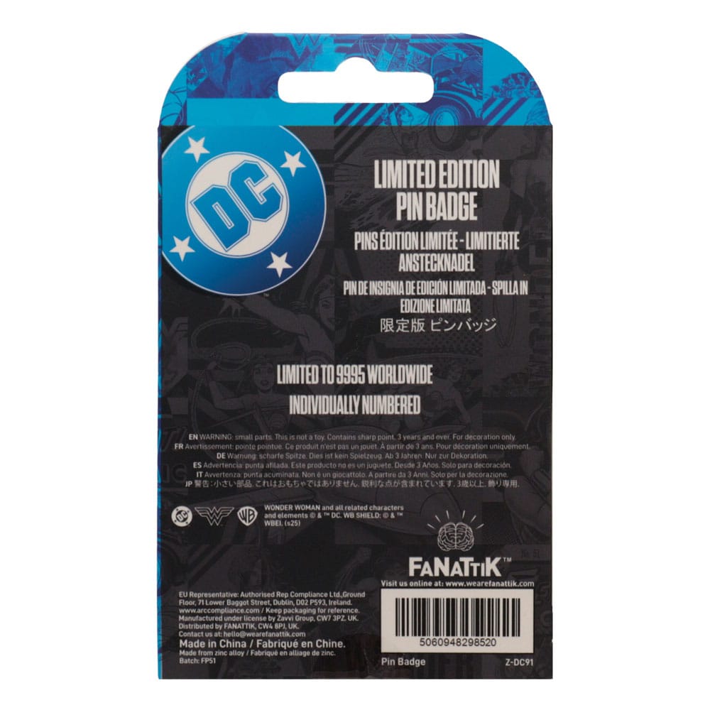 Each metal badge is individually numbered and is intricately detailed with vibrant enamel making it perfect for jackets, bags, lanyards, or general display. Whether you're a lifelong fan or searching for a heroic gift, this Wonder Woman enamel pin badge brings the strength and spirit of an Amazon warrior right into your collection.