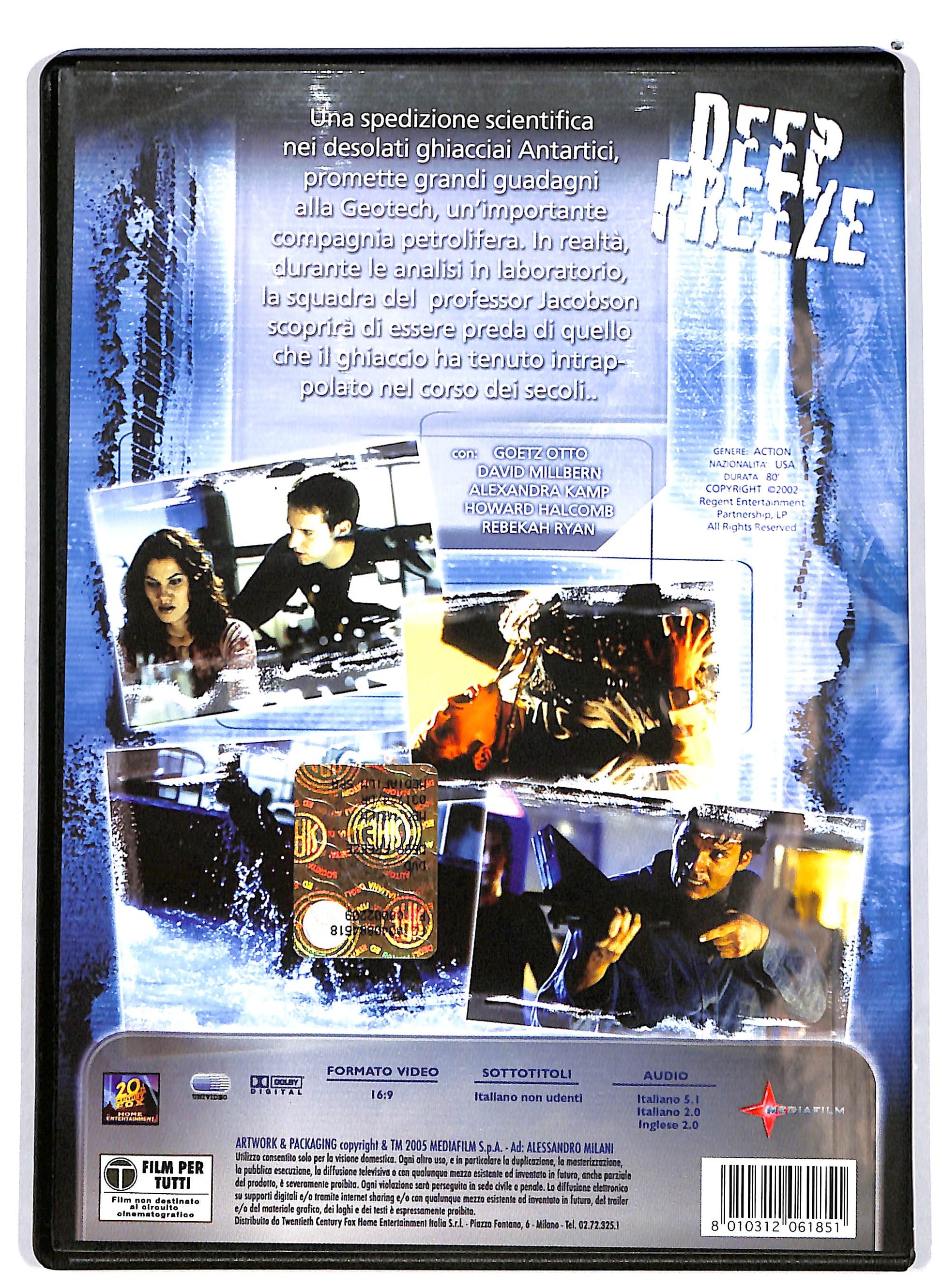 Deep Freeze di John Carl Buechler trama: Un'importante compagnia petrolifera invia un gruppo di scienziati tra i ghiacci dell'Antartide per una serie di analisi. Rimarranno vittime di cio che il ghiaccio ha intrappolato per secoli. Produttore: media film Genere: Azione Regia: John Carl Buechler Attori: Gotz Otto, Alexandra Kamp-Groeneveld, Karen Nieci, Howard Holcomb, Allen Lee Haff Lingue: Inglese, Italiano Colori: Colori Anno di produzione: 2003 Durata: 80' Sottotitoli: Italiano per non udenti Formato Audio: Dolby Digital 5.1 Nazione: Stati Uniti .