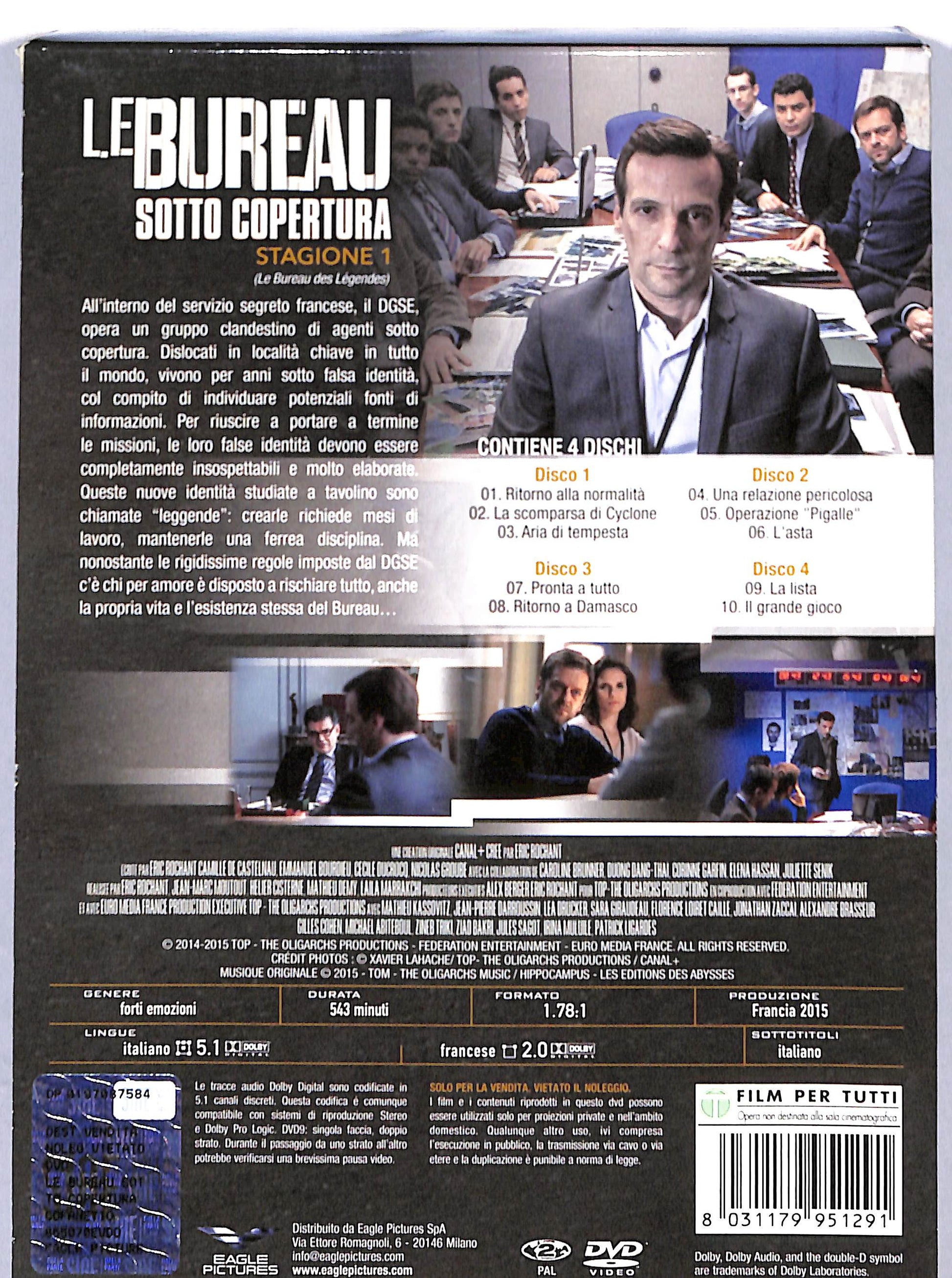 ''Ad oggi questa e la miglior serie mai prodotta in Francia'' - Le Figaro ''La serie si afferma come una delle migliori produzioni francesi'' - Le Monde All'interno del servizio segreto francese, il DGSE, opera un gruppo clandestino di agenti sotto copertura. Dislocati in localita chiave in tutto il mondo, vivono per anni sotto falsa identita, col compito di individuare potenziali fonti di informazioni. Per riuscire a portare a termine le missioni, le loro false identita devono essere completamente insospettabili e molto elaborate. Queste nuove identita studiate a tavolino sono chiamate ''leggende'': crearle richiede mesi di lavoro, mantenerle una ferrea disciplina. Ma nonostante le rigidissime regole imposte dal DGSE c'e chi per amore e disposto a rischiare tutto, anche la propria vita e l'esistenza stessa del Bureau. EPISODI . RITORNO ALLA NORMALITA . LA SCOMPARSA DI CYCLONE . ARIA DI TEMPESTA . UNA RELAZIONE PERICOLOSA . OPERAZIONE PIGALLE . L'ASTA . PRONTA A TUTTO . RITORNO A DAMASCO . LA LISTA . IL GRANDE GIOCO Dettagli Titolo originale: Le Bureau des legendes Regia : Eric Rochant, Helier Cisterne Interpreti: Mathieu Kassovitz, Sara Giraudeau, Jean-Pierre Darroussin, Lea Drucker, Zineb Triki, Gilles Cohen, Florence Loiret Caille, Patrick Ligardes, Jonathan Zaccai, Alexandre Brasseur, Michael Abiteboul Paese : Francia Anno : 2017 Supporto: DVD EAN: 8031179951291 Informazioni aggiuntive Produzione: Eagle Pictures, 2018 Distribuzione: Eagle Pictures Durata : 543 min Lingua audio: Italiano (Dolby Digital 2.0);Francese (Dolby Digital 5.1) Lingua sottotitoli: Italiano Formato Schermo: 1,78:1 Wide Screen PAL