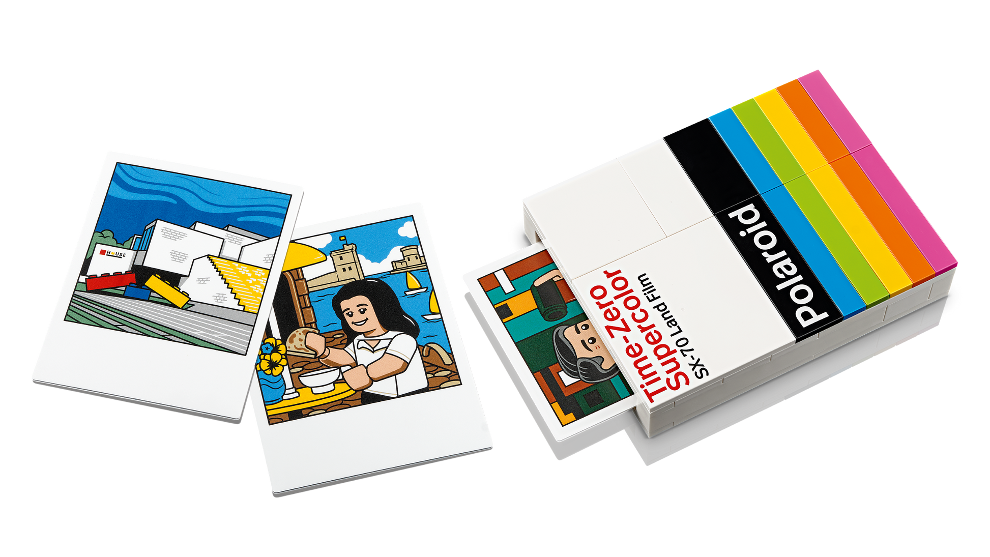 - Pack di pellicole Time-Zero Supercolor SX-70 Land costruibili: la confezione contiene 3 ''foto'' illustrate dell'inventore della Polaroid Edwin H. Land, della LEGO® House e della sorella del fan designer che ha ispirato questa creazione