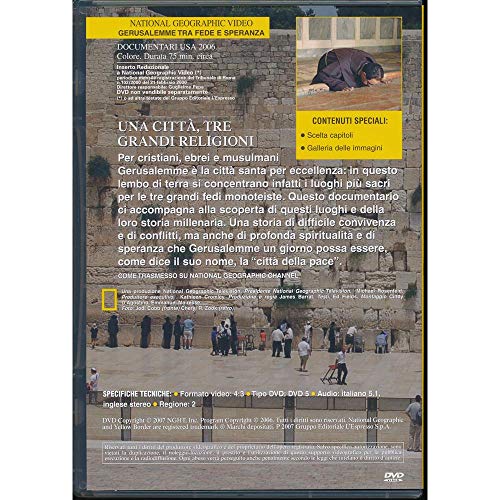 Questo documentario ci accompagna alla scoperta di questi luoghi e della loro storia millenaria. Una storia di difficile convivenza e di conflitti, ma anche di profonda spiritualita e di speranza che Gerusalemme un giorno possa essere come dice il suo nome, la ''citta della pace''.