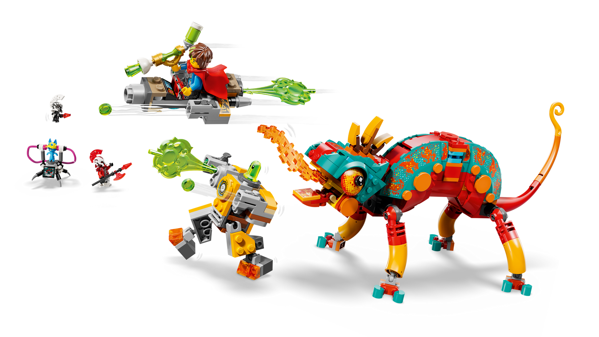 - Giocattolo ricostruibile: il camaleonte giocattolo è dotato di bocca, testa, coda, occhi e gambe snodabili e può essere costruito come un camaleonte guardiano del fuoco con torretta blaster e shooter o jet e mini mech