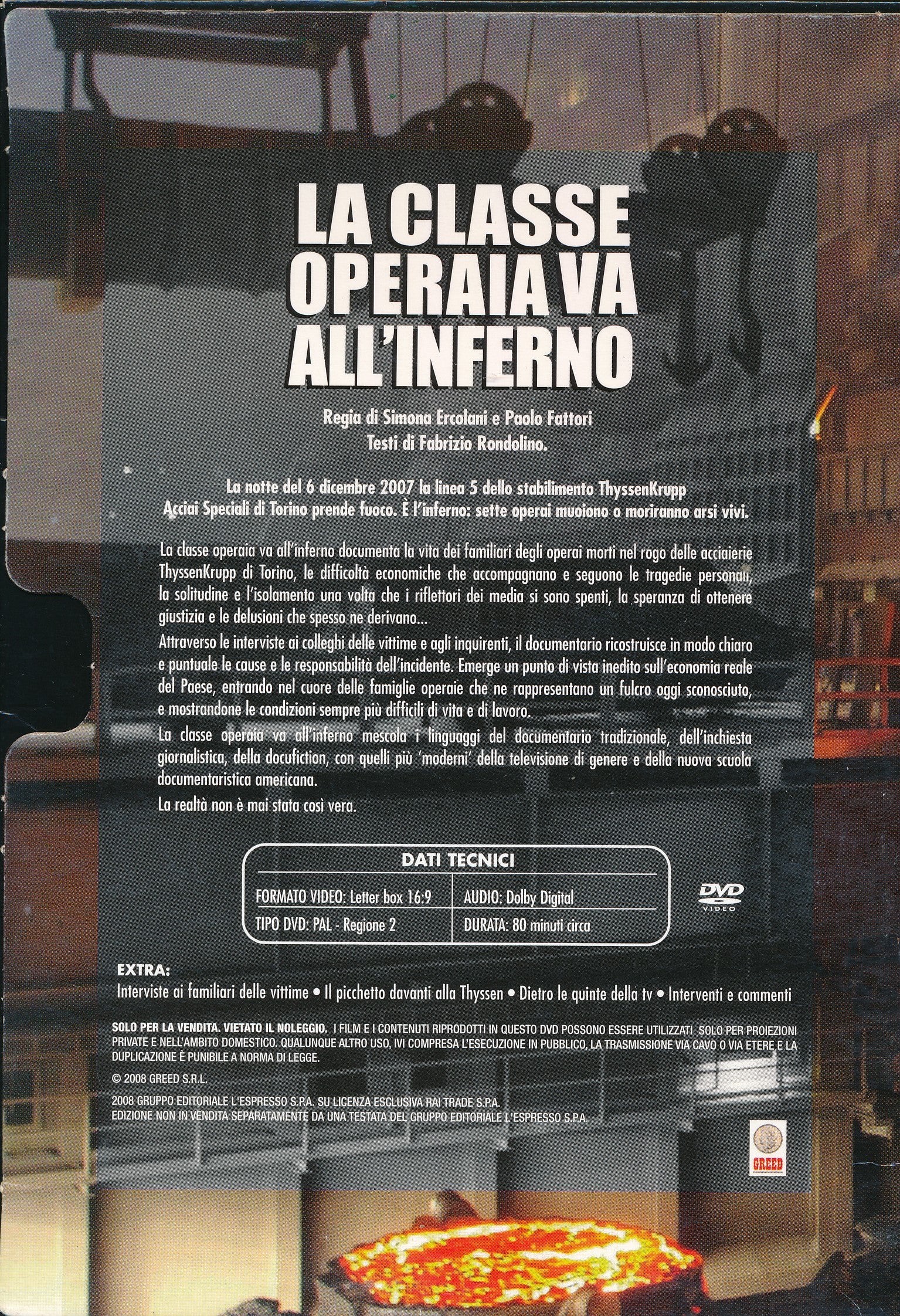 La classe operaia va all'inferno documenta la vita dei familiari e dei colleghi degli operai morti nel rogo della Thyssen, le mille difficolta materiali che acompagnano e seguono le tragedie personali, la solitudine e l'isolamento una volta che i riflettori dei media si sono spenti, la speranza di ottenere giustizia a lavoro e il senso d'impotenza che spesso l'accompagna. Due capitoli allargano il discorso ad una tragedia dimenticata, l'esplosione del Molino Cordero, e ad una tragedia inimmaginabile, i ragazzi rumeni ridotti in schiavitu nei sotterranei di Torino. La classe operaia va all'inferno propone un punto di vista autentico (e inedito) sull'economia reale del paese, entrando nel cuore delle famiglie operaie che ne rappresentano un fulcro oggi sconosciuto, e mostrandone le condizioni di vita e di lavoro ormai divenute impossibili. La mitica classe operaie degli Anni '50 - '70 non c'e piu; al suo posto, decine e centinaia di migliaia di donne e di uomini vivono senza identita turni di lavoro massacranti, in condizioni di sicurezza inesistenti, con salari che non bastano a raggiungere la terza settimana del mese.