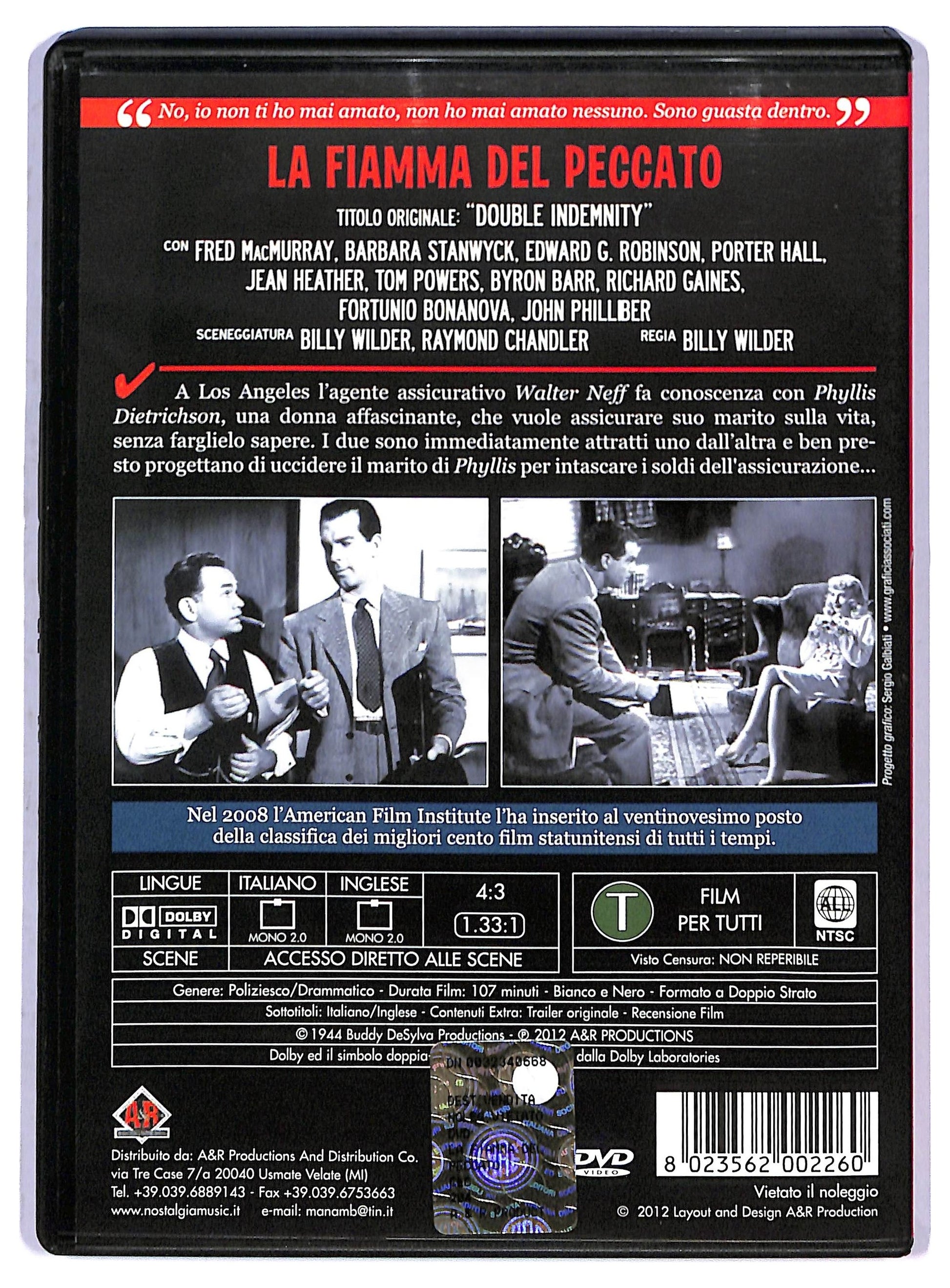 Titolo originale: Double Indemnity Regia: Billy Wilder Interpreti: Fred MacMurray, Barbara Stanwyck, Edward G. Robinson, Tom Powers, Fortunio Bonanova, Jean Heather, Porter Hall Paese: Stati Uniti Anno: 1944 Supporto: DVD EAN: 8023562002260 Informazioni aggiuntive Produzione: A & R Productions, 2016 Distribuzione: A & R Productions Durata: 107 min Lingua audio: Italiano (Dolby Digital 2.0 - mono);Inglese (Dolby Digital 2.0 - mono) Lingua sottotitoli: Italiano; Inglese Formato Schermo: Full screen Contenuti: manifesto originale; trailers; foto; commenti critici
