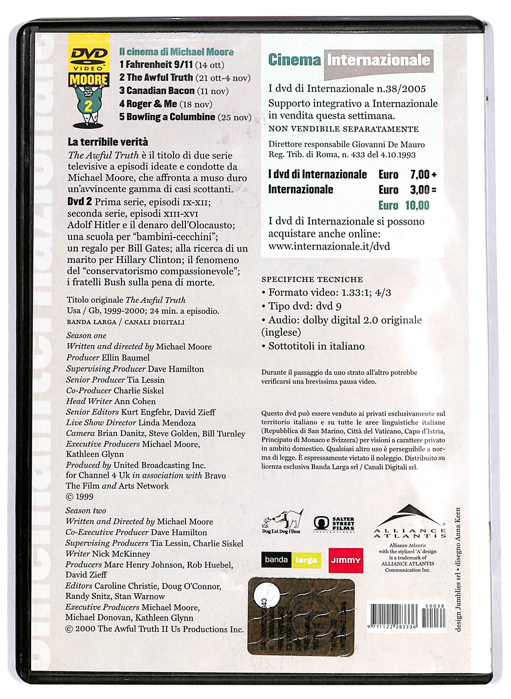 La terribile verita The Awful Truth e il titolo di due serie televisive a episodi ideate e condotte da Michael Moore, che affronta a muso duro un'avvincente gamma di casi scottanti. DA 2 Prima serie, episodi rx-xu; seconda serie, episodi xm-xvi Adolf Hitler e il denaro dell'Olocausto; una scuola per ''bambini-cecchini''; un regalo per Bill Gates; alla ricerca di un marito per Hillary Clinton; il fenomeno del ''conservatorismo compassionevole''; i fratelli Bush sulla pena di morte.