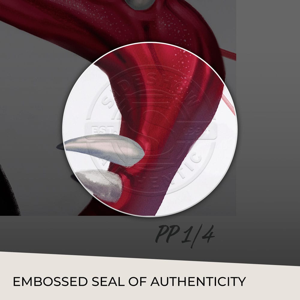 Originally created as a variant cover for King in Black: Gwenom vs. Carnage #1 (2021), written by Seanan McGuire for Marvel Comics, this Venom art is now available to fans as an unframed giclée print or in a custom framed presentation. Each Gwenom vs. Carnage Fine Art Print features an authorized, automated artist signature and an embossed Sideshow Seal of Authenticity as part of the limited edition of 200 pieces.