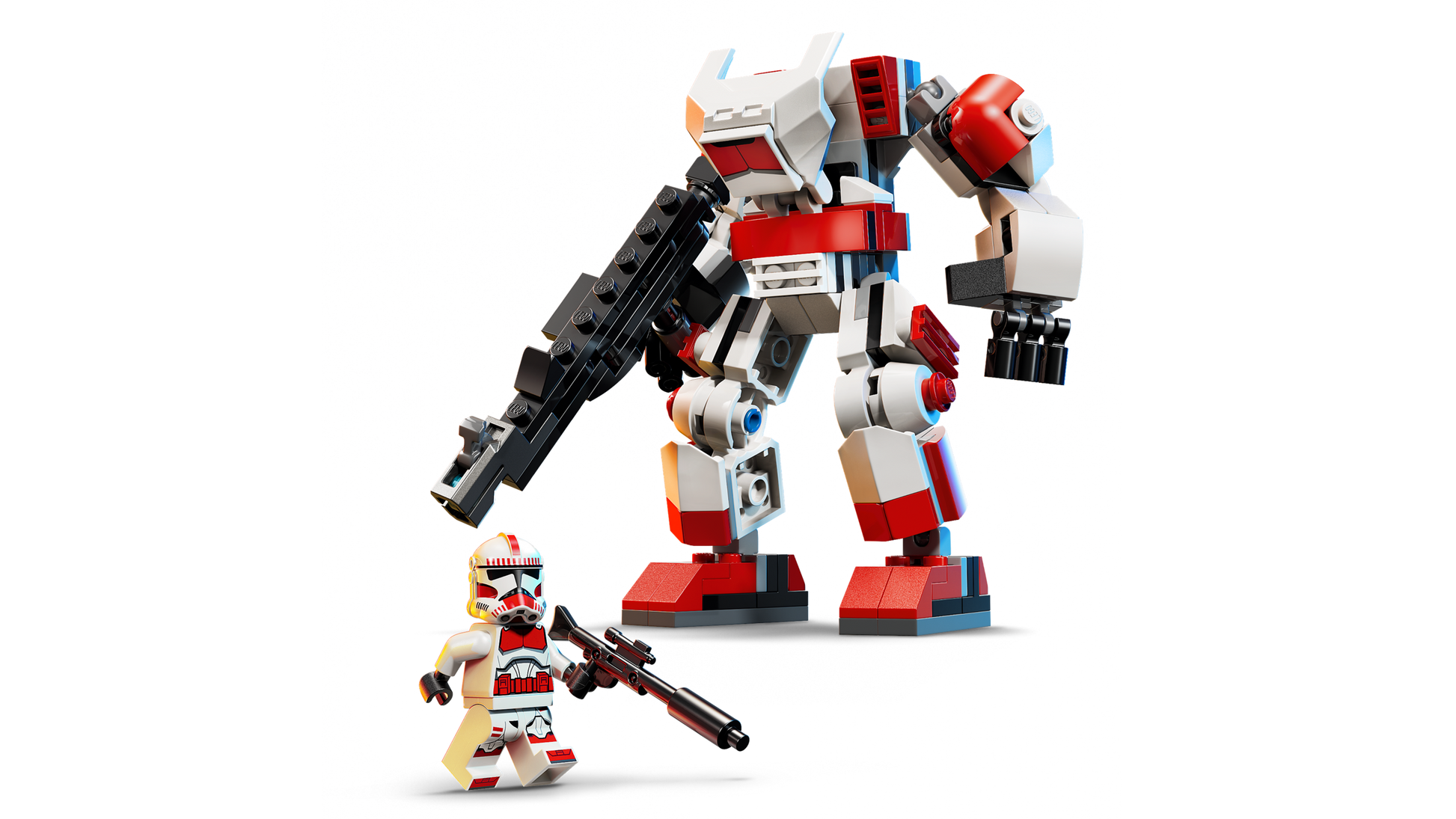 - MINIFIGURE LEGO® STAR WARST: posiziona la minifigure del Clone Shock Trooper LEGO nel cockpit del mech corazzato e aggancia il suo fucile blaster sul retro