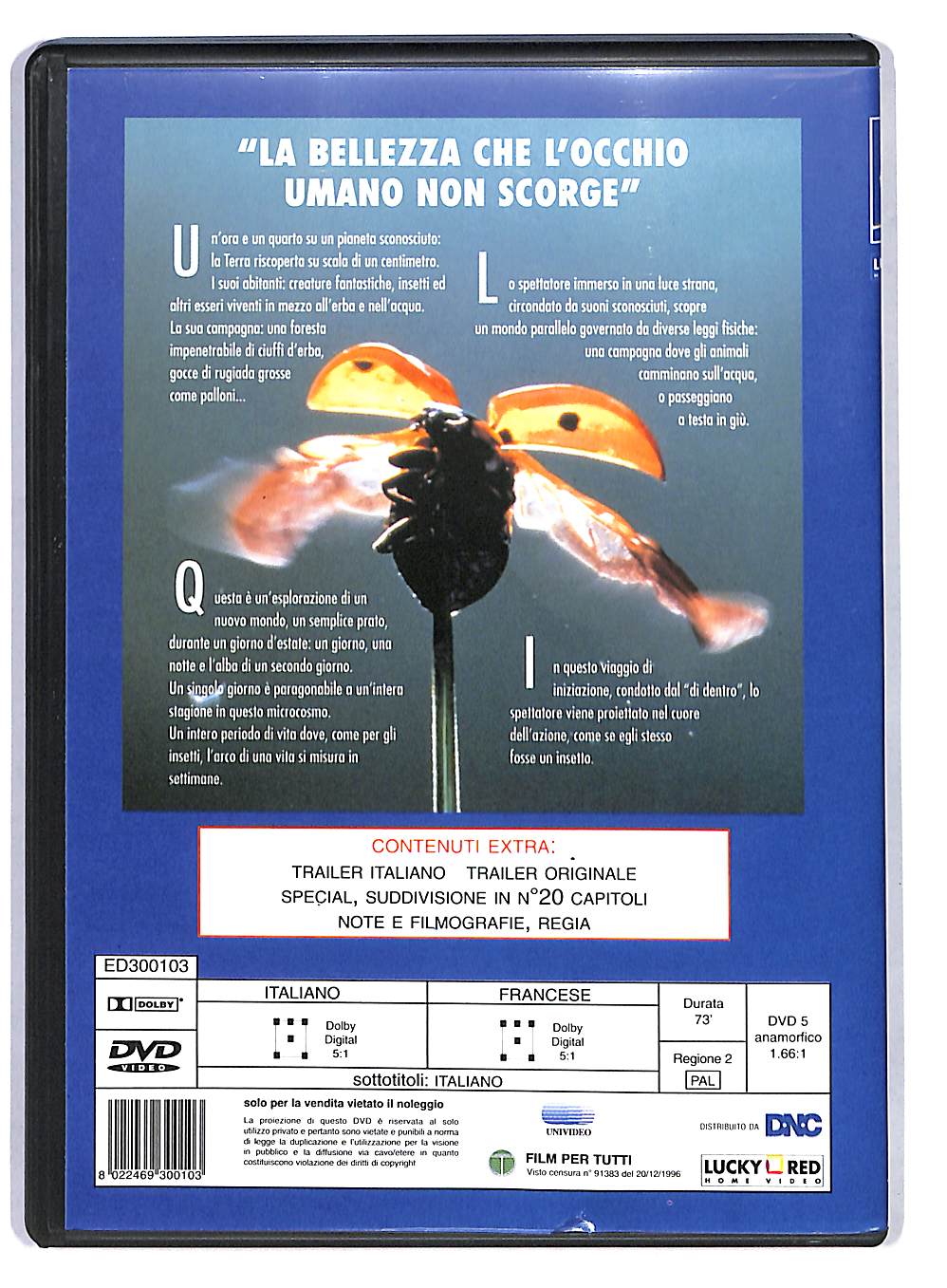 Un'ora e un quarto su un pianeta sconosciuto: la Terra riscoperta su scala di un centimetro. I suoi abitanti: creature fantastiche, insetti ed altri esseri viventi in mezzo all'erba e nell'acqua. La sua campagna: una foresta impenetrabile di ciuffi d'erba, gocce di rugiada grosse come palloni. Questa e l'esplorazione di un nuovo mondo, un semplice prato, durante un giorno d'estate: un giorno, una notte e l'alba di un secondo giorno. Un singolo giorno e paragonabile a un'intera stagione in questo microcosmo. Un intero periodo di vita dove, come per gli insetti, l'arco di una vita si misura in settimane.... VD