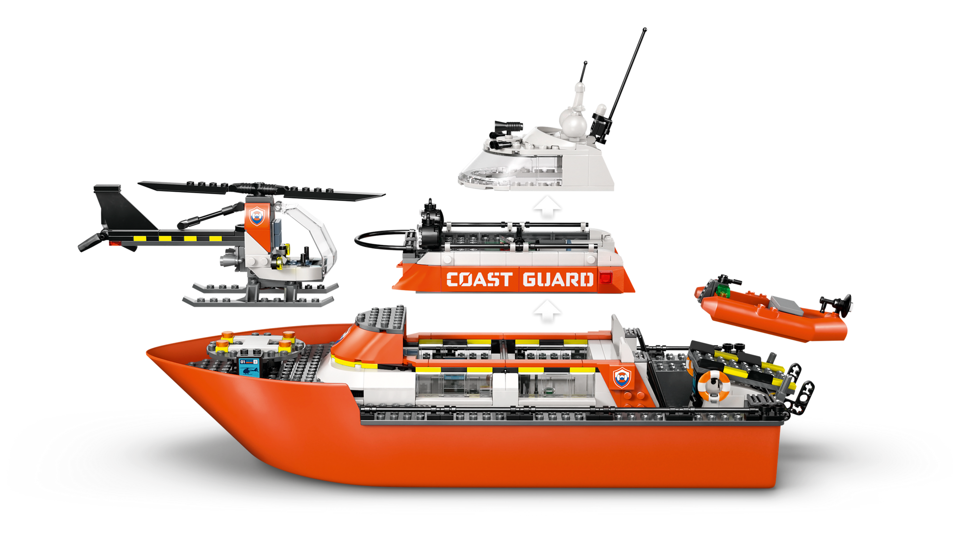 - COSA C'È NELLA SCATOLA: include tutto ciò di cui i bambini hanno bisogno per costruire una barca da soccorso della guardia costiera LEGO®, un elicottero di soccorso e 2 gommoni galleggianti, oltre a 5 minifigure e un cane