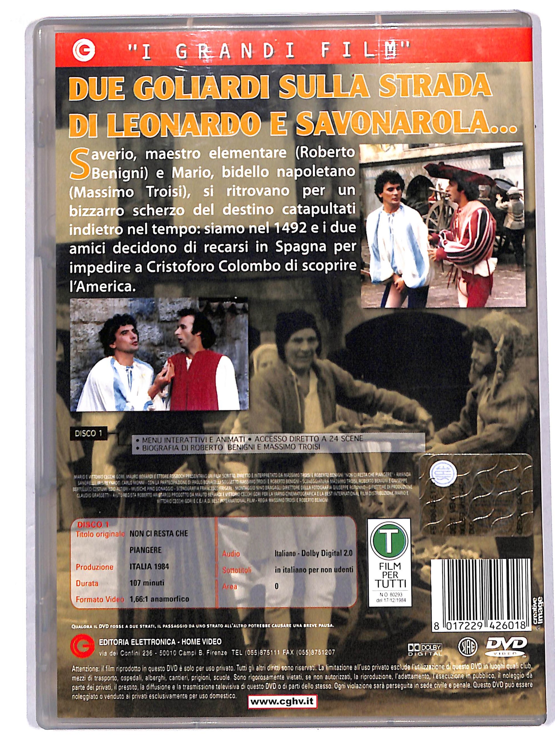 Saverio, maestro elementare e il bidello Mario, fermi con la macchina a un passaggio a livello eterno, cercano una via d'uscita d'emergenza, vengono sorpresi da un temporale e riparano per la notte in una vecchia locanda, dentro la quale si destano l'indomani inspiegabilmente immersi in un improbabile anno 1492. Tentano goffamente di assumere l'abbigliamento, il linguaggio e le usanze d'epoca e si trovano implicati in farsesche avventure, finche a Saverio spunta l'idea - visto che e l'anno 1492 - di correre in Spagna a fermare Cristoforo Colombo, per impedirgli di scoprire l'America, da cui vengono infiniti mali, a cominciare dal vezzo linguistico dell' 'okey' diffuso fra noi in maniera cosi pecoreccia. Nel tragitto incorrono in altre avventure, fra le quali l'incontro con un'amazzone di colore e poi con Leonardo Da Vinci, che tentano di erudire sulle novita scientifiche, con la loro saputa ignoranza anni '80, per cui ritardano e arrivano a Palo dopo che Colombo e gia salpato. Mentre, spompati, s'apprestano a ritornare sui propri passi, avvertono lo sbuffare e lo sferragliare di una locomotiva. Speranzosi, si precipitano verso i binari, sicuri di esser riapprodati al secolo XX, se non che dalla locomotiva si sporge compiaciuto Leonardo...che ha imparato la lezione. Veramente 'non resta che piangere'