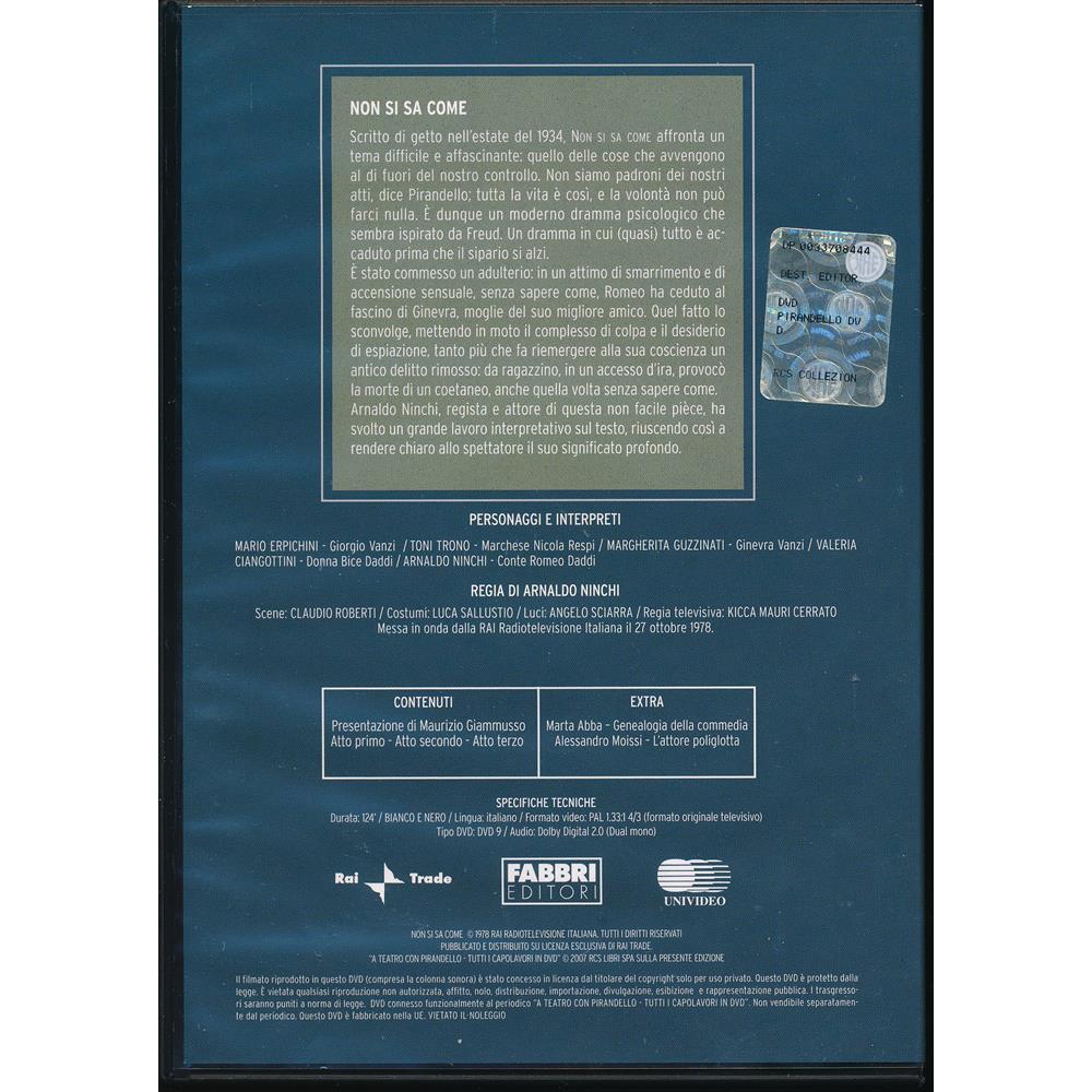 NON SI SA COME - Scritto di getto nell'estate del 1934, NON SI SA COME affronta un tema difficile e affascinante: quello delle cose che avvengono al di fuori del nostro controllo. Non siamo padroni del nostri atti, dice Pirandello, tutta la vita e cosi, e la volonta non puo farci nulla. E' dunque un moderno dramma psicologico che sembra ispirato da Freud. Un dramma in cui (quasi) tutto e accaduto prima che il sipario si alzi. E stato commesso un adulterio in un attimo di smarrimento e di accensione sensuale, senza sapere come, Romeo ha ceduto al fascino di Ginevra, moglie del suo migliore amico quel fatto lo Sconvolge, mettendo in moto il complesso di colpa e il desiderio di espiazione, tanto piu che fa riemergere alla sua coscienza un antico delito rimosso: da ragazino, in un accesso d'ira, provoco la morte di un coetaneo, anche quella volta senza sapere come. Arnaldo Ninchi, regista e attore di questa non facile piece ha svolto un grande lavoro interpretativo sul testo, riuscendo cosi a rendere chiaro allo spettatore il suo significato profondo.
