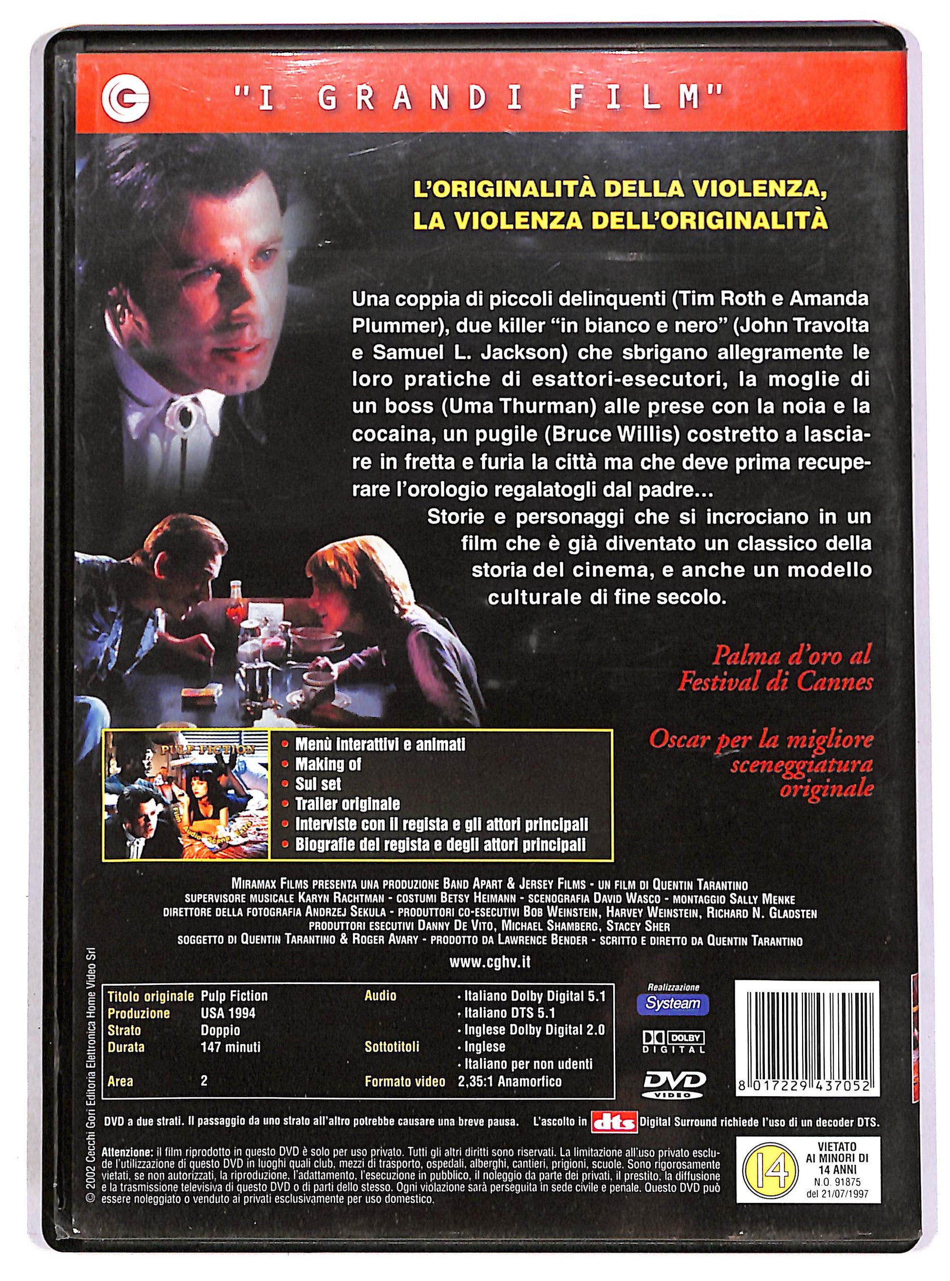 Attori: John Travolta, Samuel L. Jackson, Uma Thurman, Bruce Willis, Tim Roth, Amanda Plummer, Maria de Medeiros, Ving Rhames, Eric Stoltz, Rosanna Arquette, Bronagh Gallagher, Christopher Walken, Harvey Keitel, Quentin Tarantino, Frank Whaley, Phil LaMarr, Peter Greene, Duane Whitaker, Steve Buscemi, Angela Jones, Sy Sher