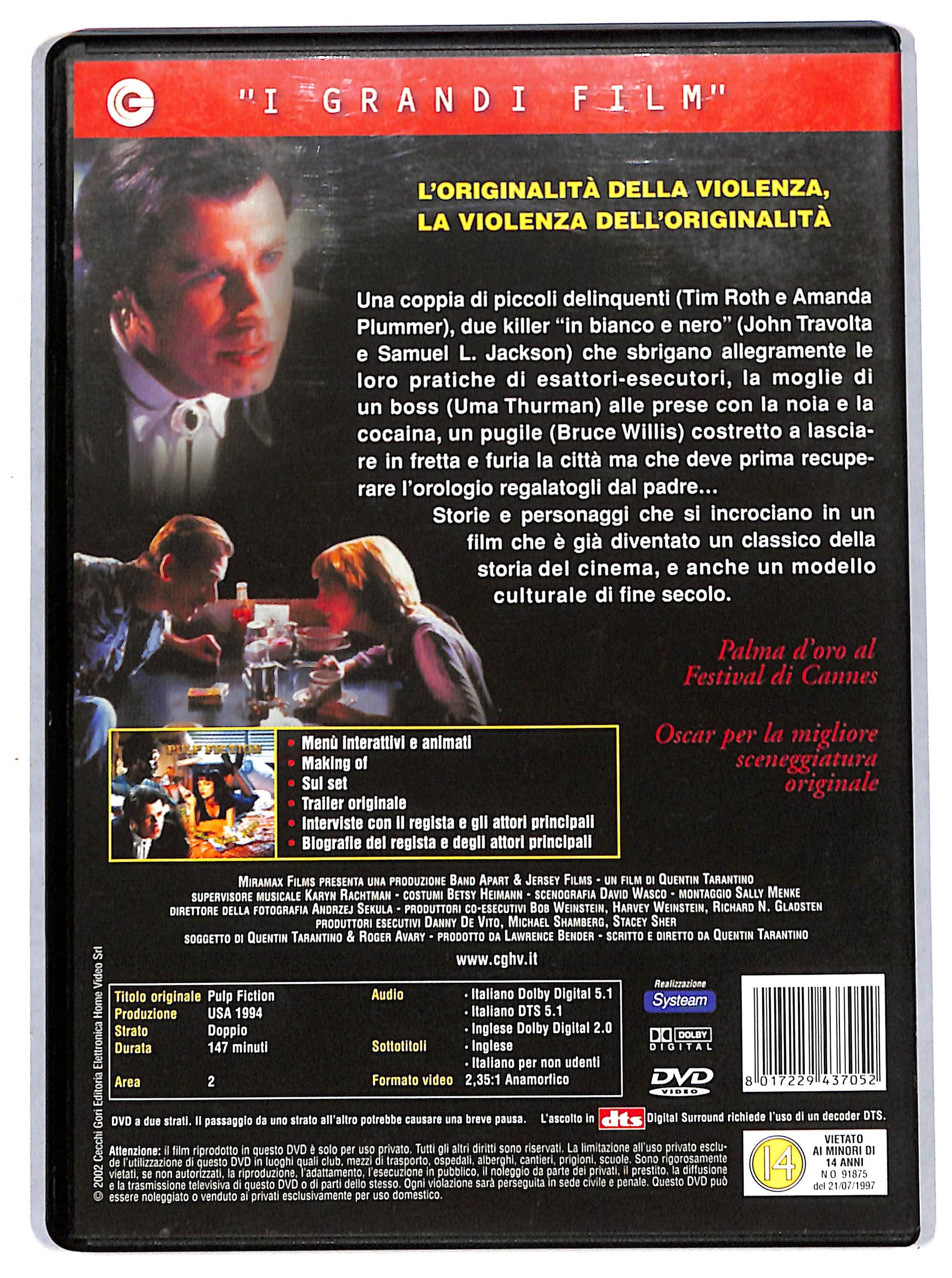 Attori: John Travolta, Samuel L. Jackson, Uma Thurman, Bruce Willis, Tim Roth, Amanda Plummer, Maria de Medeiros, Ving Rhames, Eric Stoltz, Rosanna Arquette, Bronagh Gallagher, Christopher Walken, Harvey Keitel, Quentin Tarantino, Frank Whaley, Phil LaMarr, Peter Greene, Duane Whitaker, Steve Buscemi, Angela Jones, Sy Sher