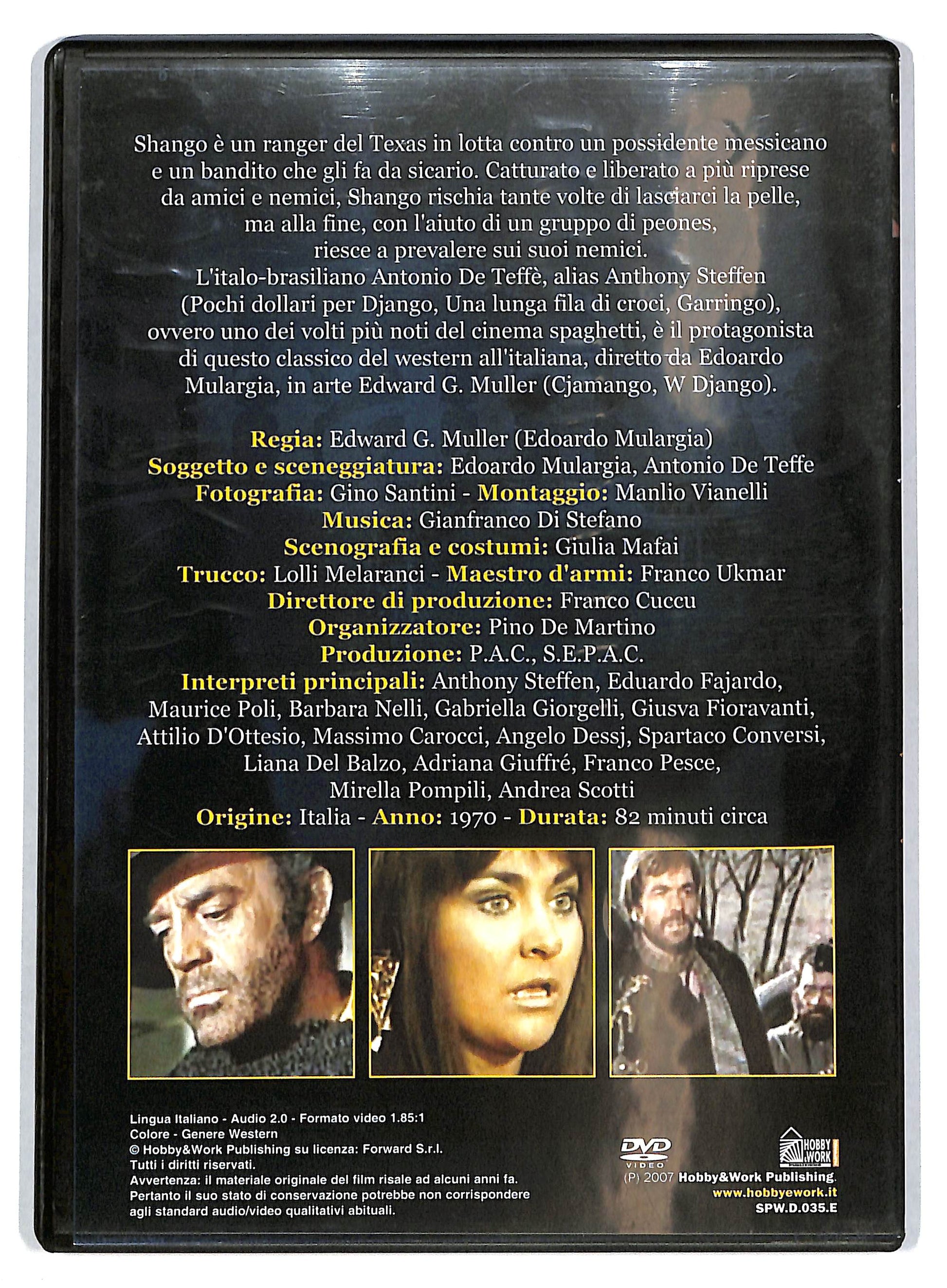 Shango, la pistola infallibile Lingua originale italiano Paese di produzione Italia Anno 1970 Durata 81 min Rapporto 2,35 : 1 Genere western Regia Edward G. Muller Soggetto Edoardo Mulargia, Antonio de Teffe Sceneggiatura Edoardo Mulargia, Antonio De Teffe Casa di produzione Produzioni Atlas Consorziate, Societa Europea Produzioni Associate Cinematografiche Distribuzione in italiano Produzioni Atlas Consorziate Fotografia Gino Santini Montaggio Manlio Vianelli Musiche Gianfranco Di Stefano Scenografia Giulia Mafai Costumi Giulia Mafai Trucco Lolly Melaranci Interpreti e personaggi Anthony Steffen: Shango Eduardo Fajardo: Droster Maurice Poli: Martinez Barbara Nelli: Consuelo Valerio Fioravanti: Pedrito Attilio Dottesio: Fernandez Massimo Carocci: Scott Spartaco Conversi: Bragna Liana Del Balzo: Tania Angelo Dessy: Pedro Adriana Giuffre: Rosaria Franco Pesce: Manuel, il telegrafista Mirella Pamphili: Marisol Andrea Scotti: Salvador Gabriella Giorgelli: Pamela Doppiatori italiani Glauco Onorato: Droster Sergio Tedesco: Martinez Vittoria Febbi: Consuelo Bruno Persa: Fernandez Luciano De Ambrosis: Scott Mario Pisu: Bragna Gino Baghetti: Manuel, il telegrafista