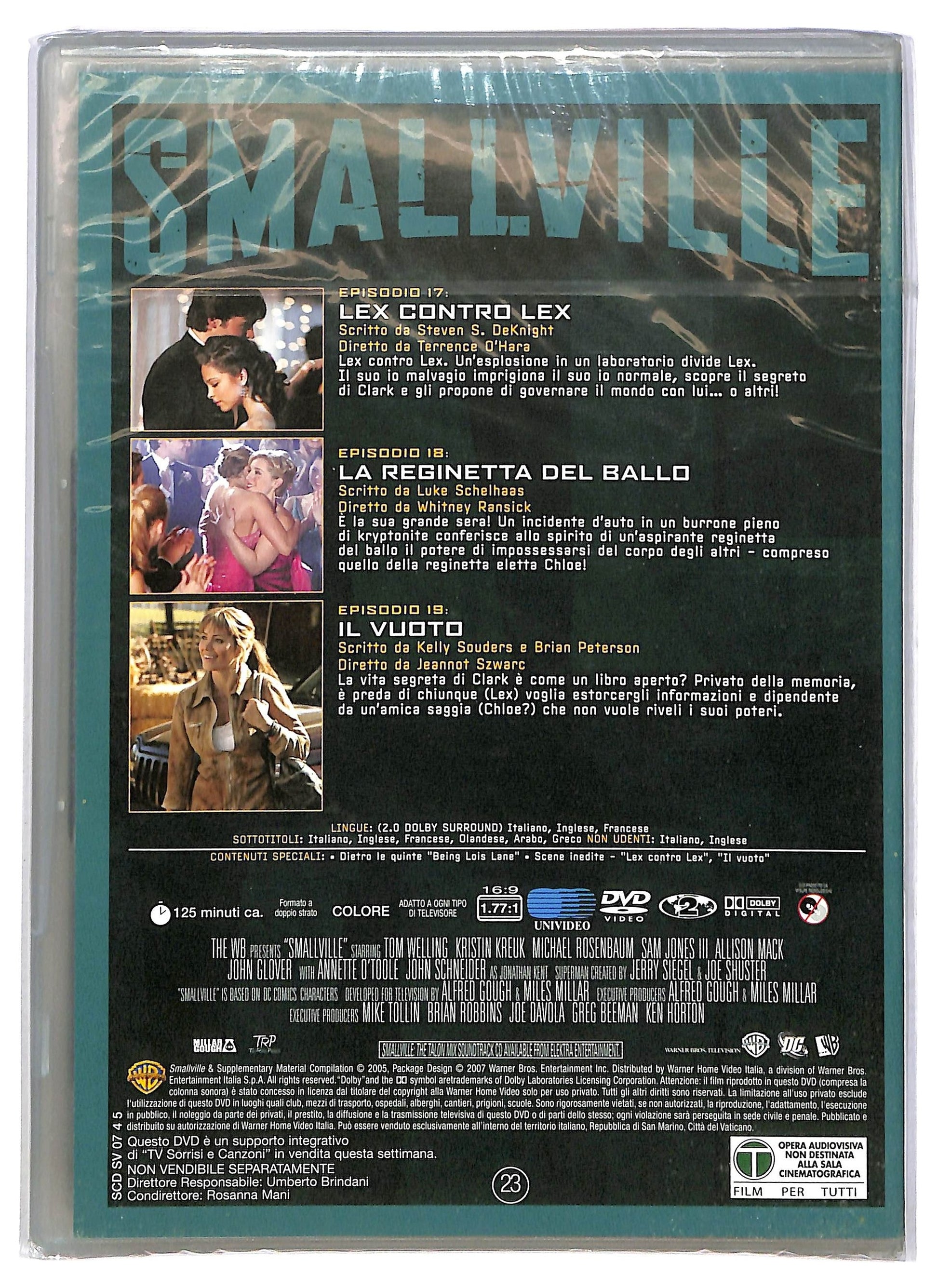 Smallville Stagione 4 Disco 5 Sinossi Tutto ha inizio in seguito alla catastrofica caduta di meteoriti contenenti un minerale radioattivo, la kryptonite, con cui molti abitanti di Smallville vengono contaminati dalle radiazioni presentando particolari mutazioni genetiche. Chloe Sullivan e Clark Kent, giornalisti in erba del liceo di Smallville, indagano su questi eventi inspiegabili fino a trovarsi piu di una volta invischiati nei loschi piani di Lionel Luthor, padre di Lex, che non sembra avere particolari problemi a spingersi fino all'omicidio per tentare di nascondere i propri affari. . .