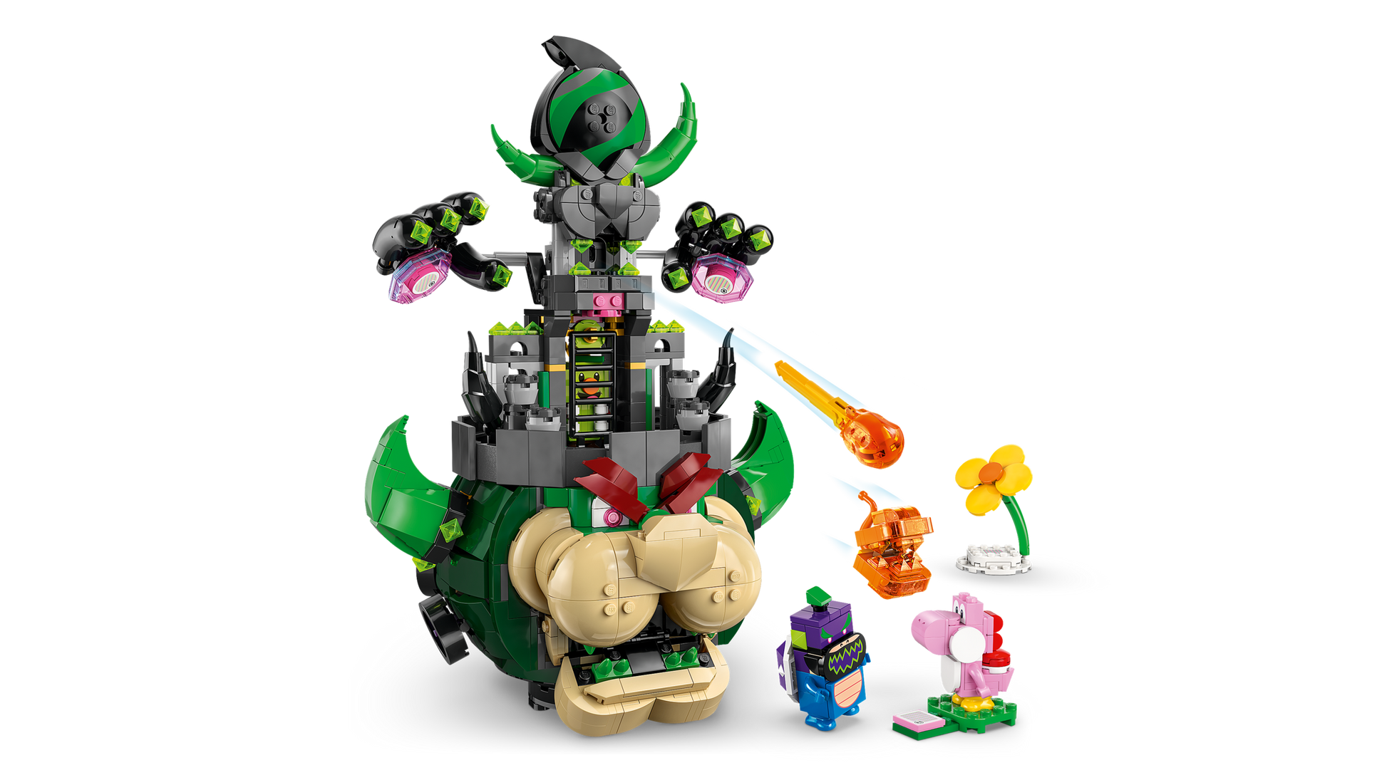 - 5 personaggi Nintendo® per il gioco di ruolo: questo set play-and-display include una grande figura costruibile di Bowser castello, oltre a Yoshi Rosa, nota Piranha infuocata, il Principe Florian e Bowser Jr Wonder