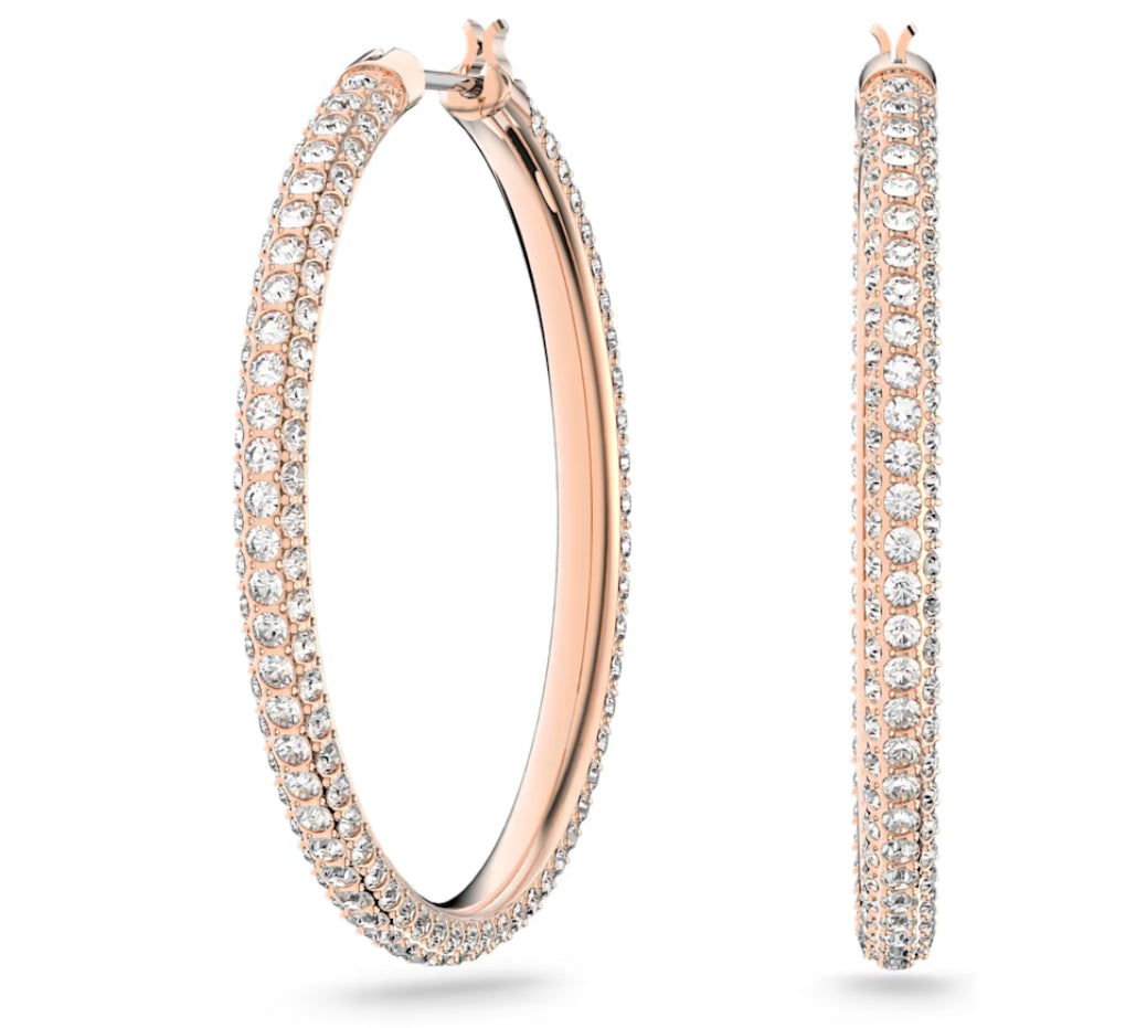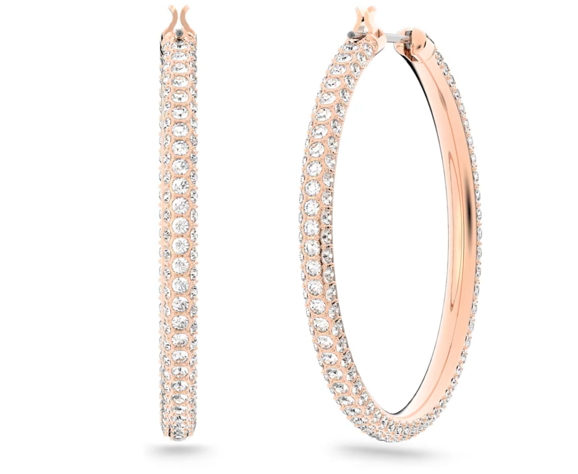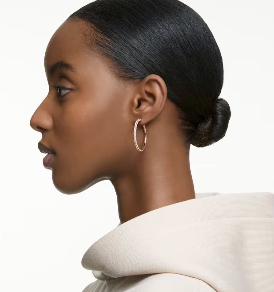 Scegli il regalo giusto per la Festa della Mamma o qualsiasi altra occasione con questo paio di cerchi d'altri tempi, decorato con pave di cristallo, per richiamare lo speciale scintillio firmato Swarovski. Il delicato design placcato oro rosa e facilmente indossabile con ogni outfit, dal giorno alla sera.