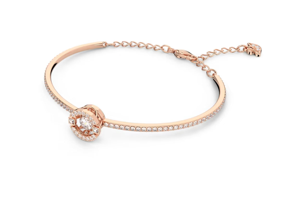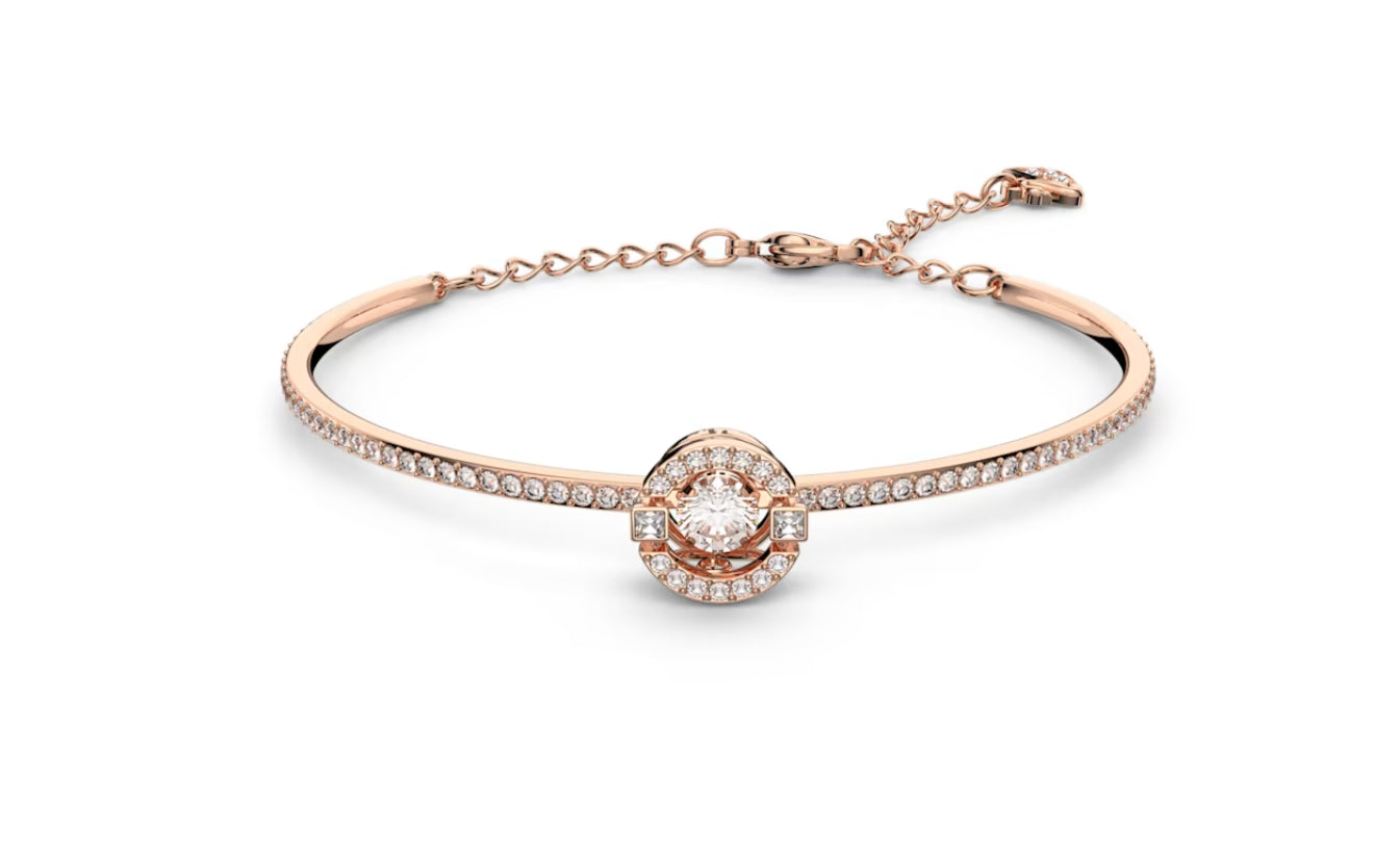 Con il suo ingresso nella nostra popolare collezione Sparkling Dance, questo squisito bangle eleva qualsiasi look con il suo intramontabile scintillio. Il design placcato nella tonalita oro rosa combina con eleganza uno straordinario elemento centrale rotondo e un pave in Clear Crystal. Un regalo perfetto per tutti coloro che apprezzano la classica eleganza con una fresca rivisitazione.