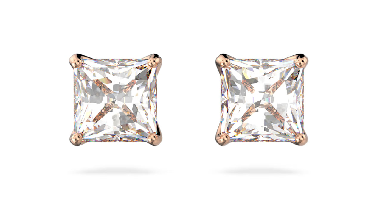Una collezione di gioielli non e completa senza questi classici stud. Incastonato con brillanti pietre dal taglio quadrato, questo meraviglioso paio placcato nella tonalita oro rosa e ricco di eleganza disinvolta. Un ''must'' intramontabile, non ti stancherai mai di indossarli.