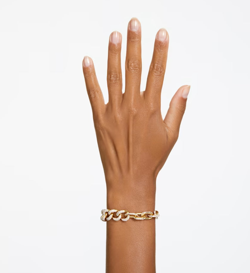 Progettato per essere genderless, questo bracciale impreziosira qualsiasi look. In perfetta armonia tra l'iconica tecnica pave di Swarovski e l'audace struttura in metallo, questo pezzo placcato oro aggiunge un tocco contemporaneo ai classici gioielli a catena. Presenta una raffinata chiusura a molla e puo essere indossato con qualsiasi outfit, dal tailleur per l'ufficio a un elegante abito da sera. Parte della famiglia Dextera, questo bracciale e ideato dalla Direttrice Creativa Giovanna Engelbert per la Collection III.