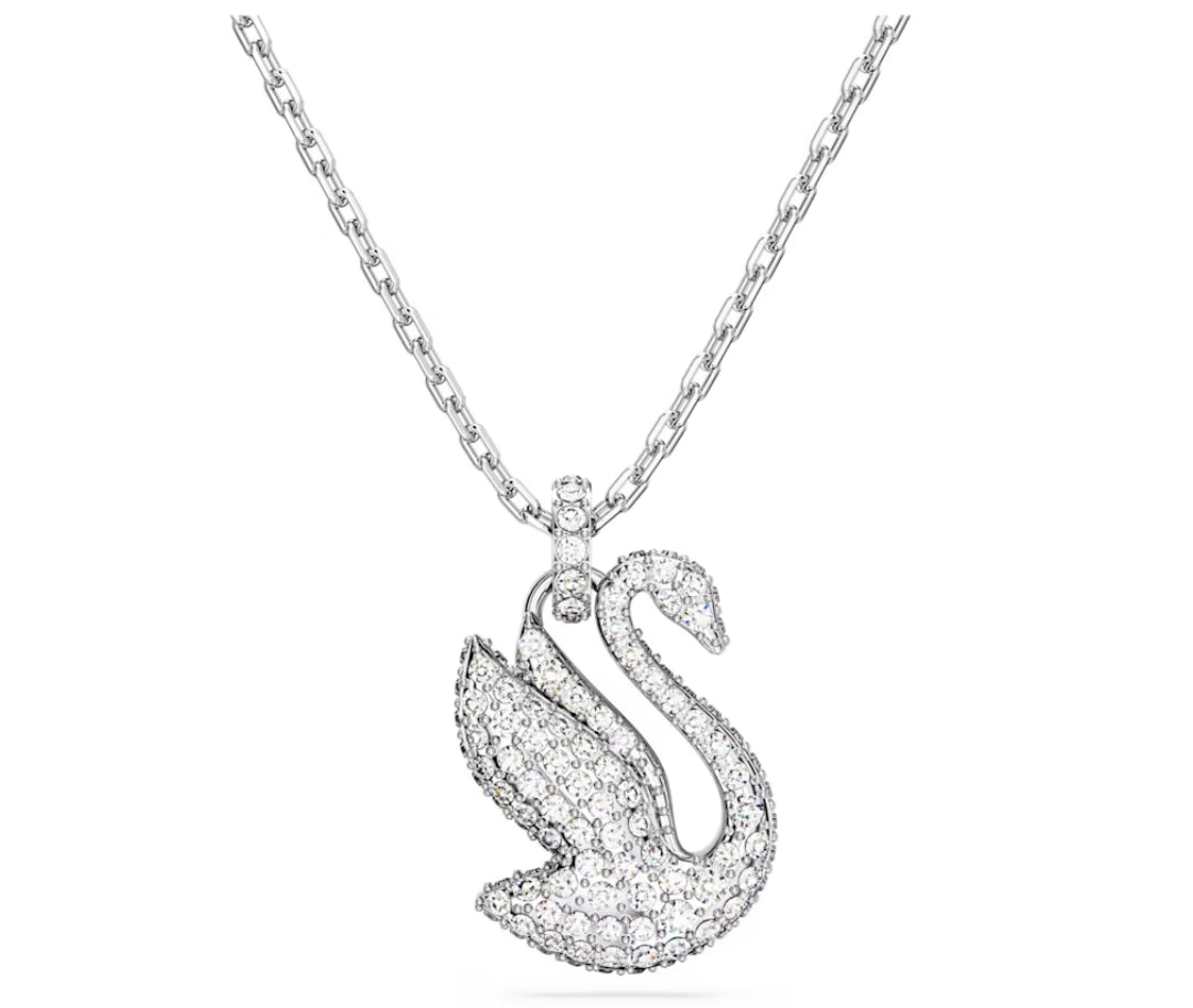 Celebrazione della grazia e della nobilta dell'iconico Cigno Swarovski, questo delicato pendente aggiungera eleganza al tuo stile. Realizzato con le ali in alto, pronto a spiccare il volo e decorato con pave di scintillanti cristalli trasparenti su una brillante placcatura rodio, sara la tua fonte di ispirazione quotidiana.
