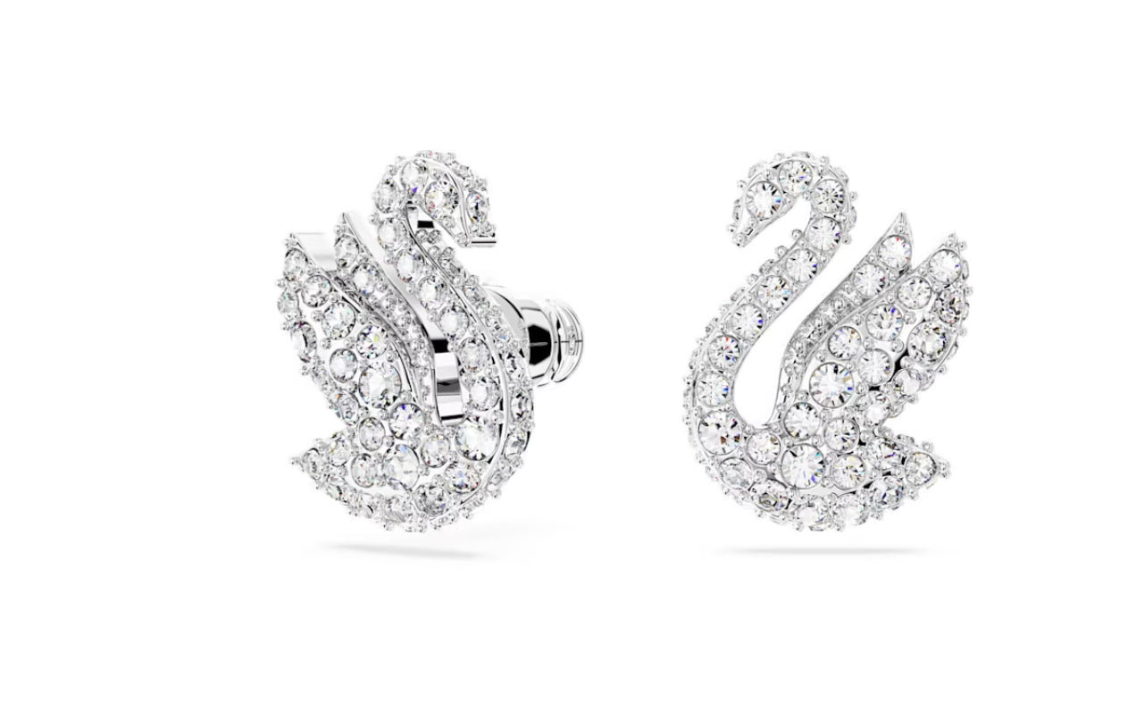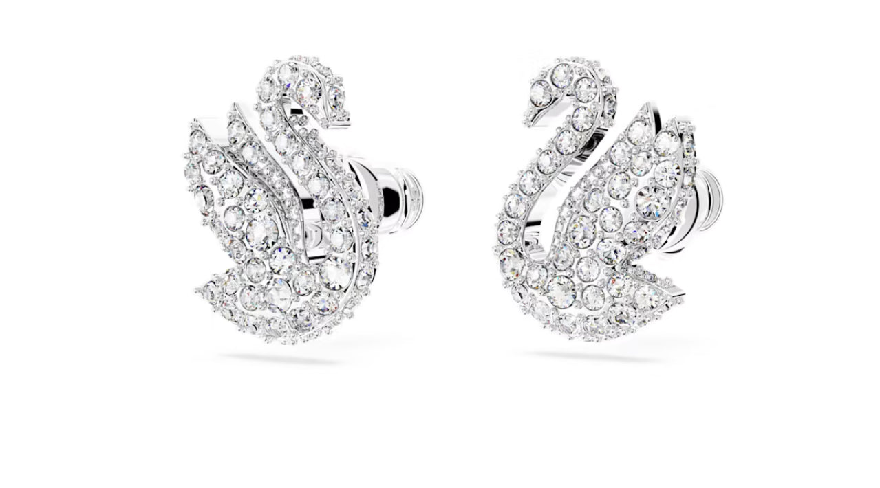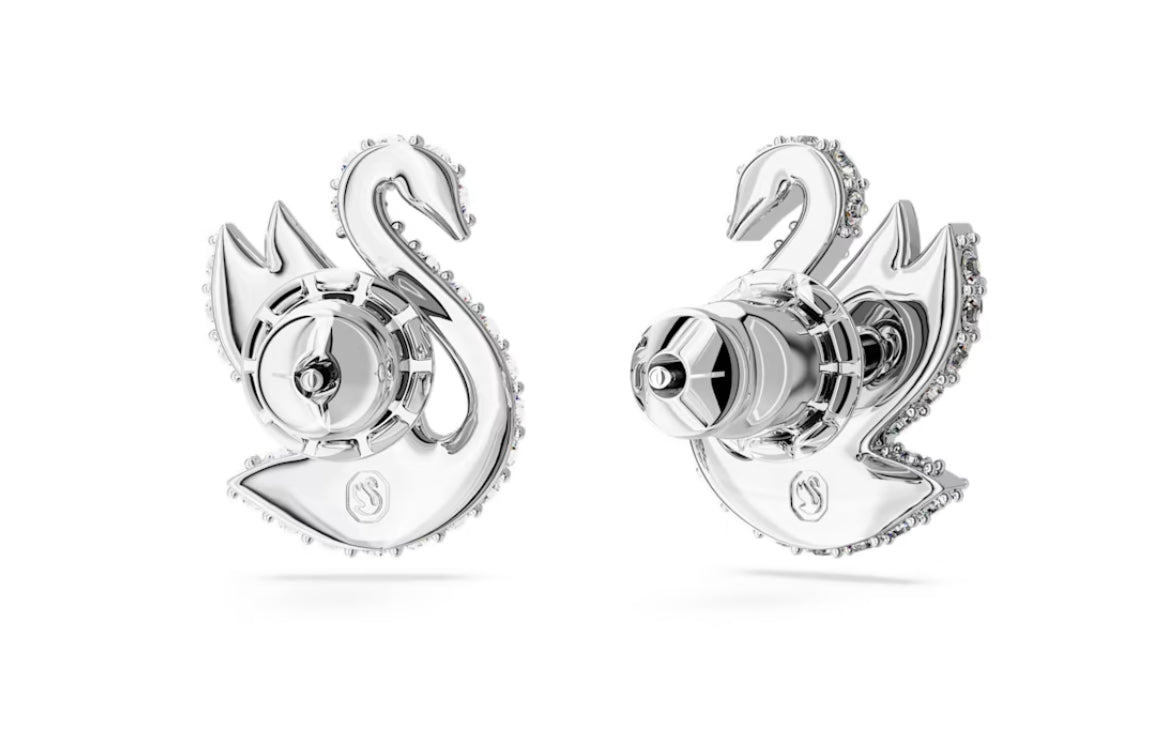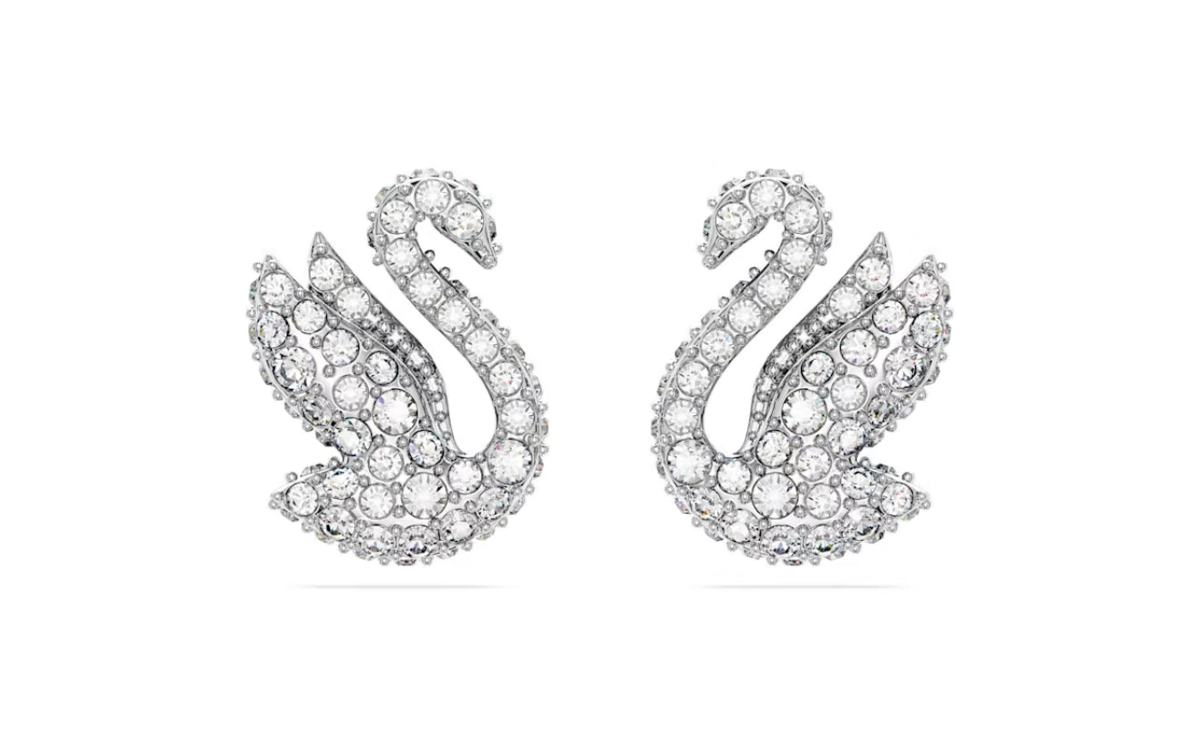 L'iconico Cigno Swarovski prende forma elegantemente in questo paio di orecchini a lobo. Realizzato con le ali in alto, pronto a spiccare il volo, il cigno e decorato con pave di scintillanti cristalli trasparenti su una brillante placcatura rodio. Scegli questo gioiello per un delicato tocco di ispirazione quotidiana.
