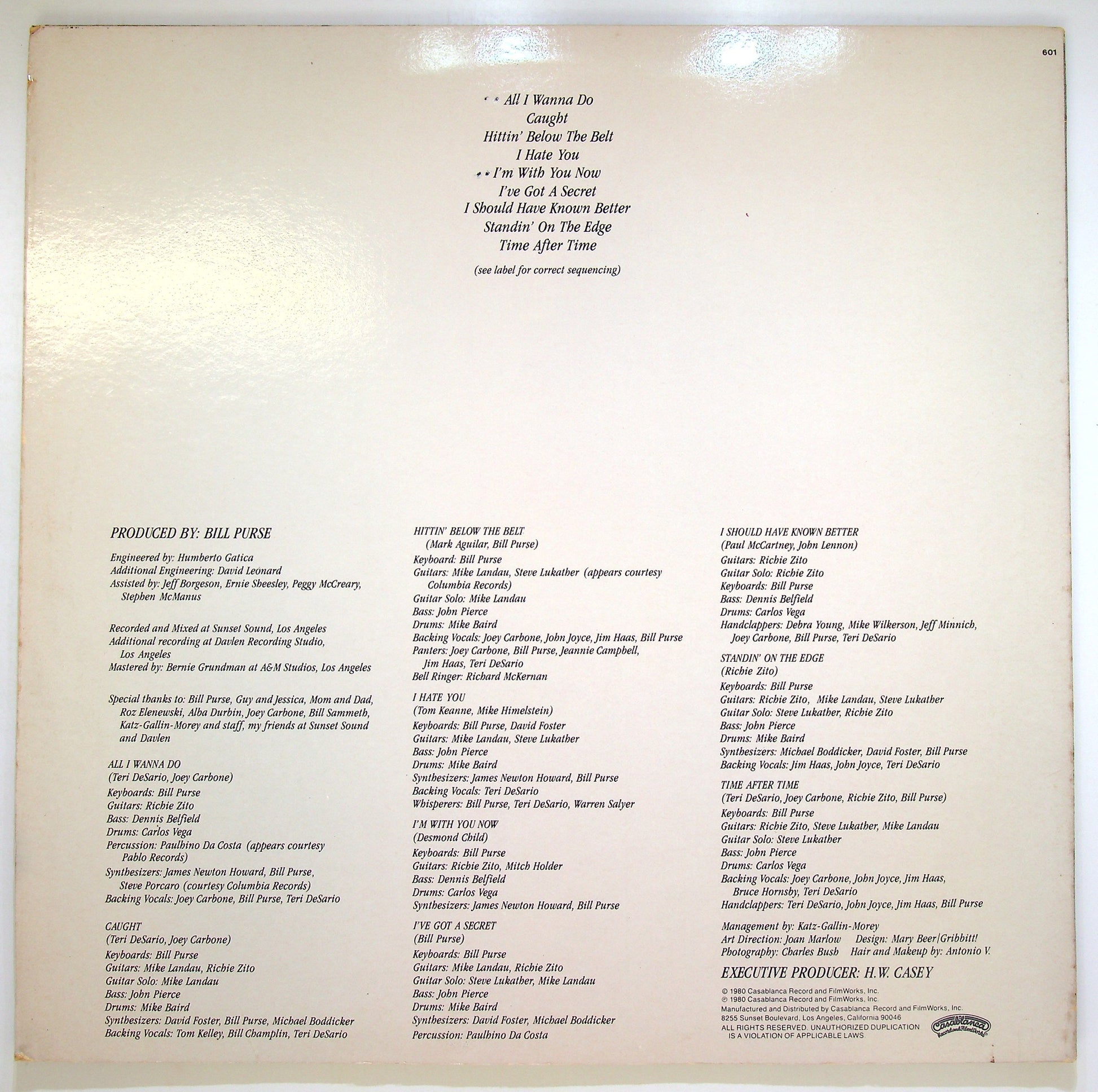 A1 Caught Bass - John Pierce Drums - Mike Baird Guitar - Mike Landau, Richie Zito Keyboards - Bill Purse Soloist [Guitar Solo] - Mike Landau Synthesizer - Bill Purse, David Foster, Michael Boddicker Written-By - Joey Carbone, Teri DeSario Bass - John Pierce Drums - Mike Baird Guitar - Mike Landau, Richie Zito Keyboards - Bill Purse Soloist [Guitar Solo] - Mike Landau Synthesizer - Bill Purse, David Foster, Michael Boddicker Written-By - Joey Carbone, Teri DeSario 4:12