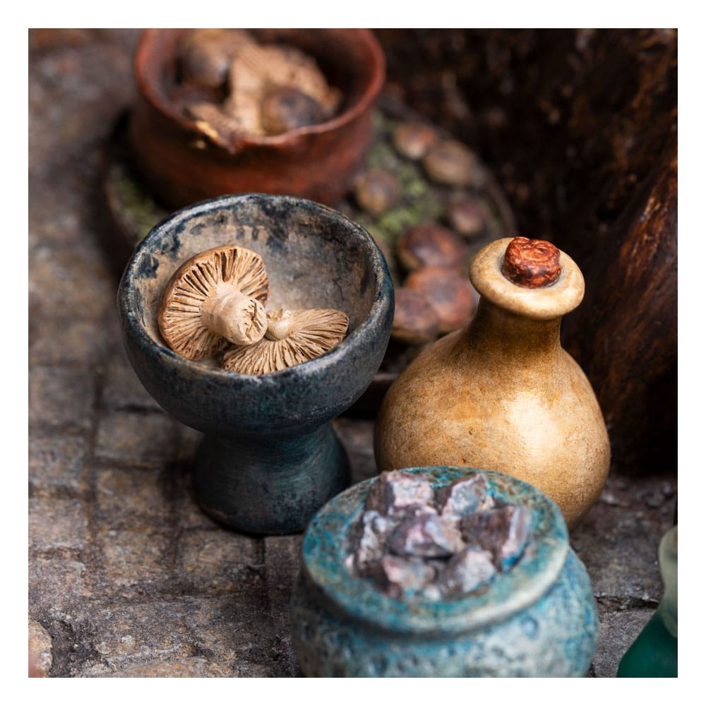 Designed with full 360° detail, Radagast in Rhosgobel invites you to explore its intricate narrative from every angle. Marvel at the tiny hand-sculpted jars and scrolls that clutter the Wizard's abode, each piece carefully crafted to tell a story of a life steeped in ancient wisdom and natural magic. The attention to detail extends to the smallest elements: delicate woodland animals hidden within the scene, their presence adding a layer of life and authenticity.