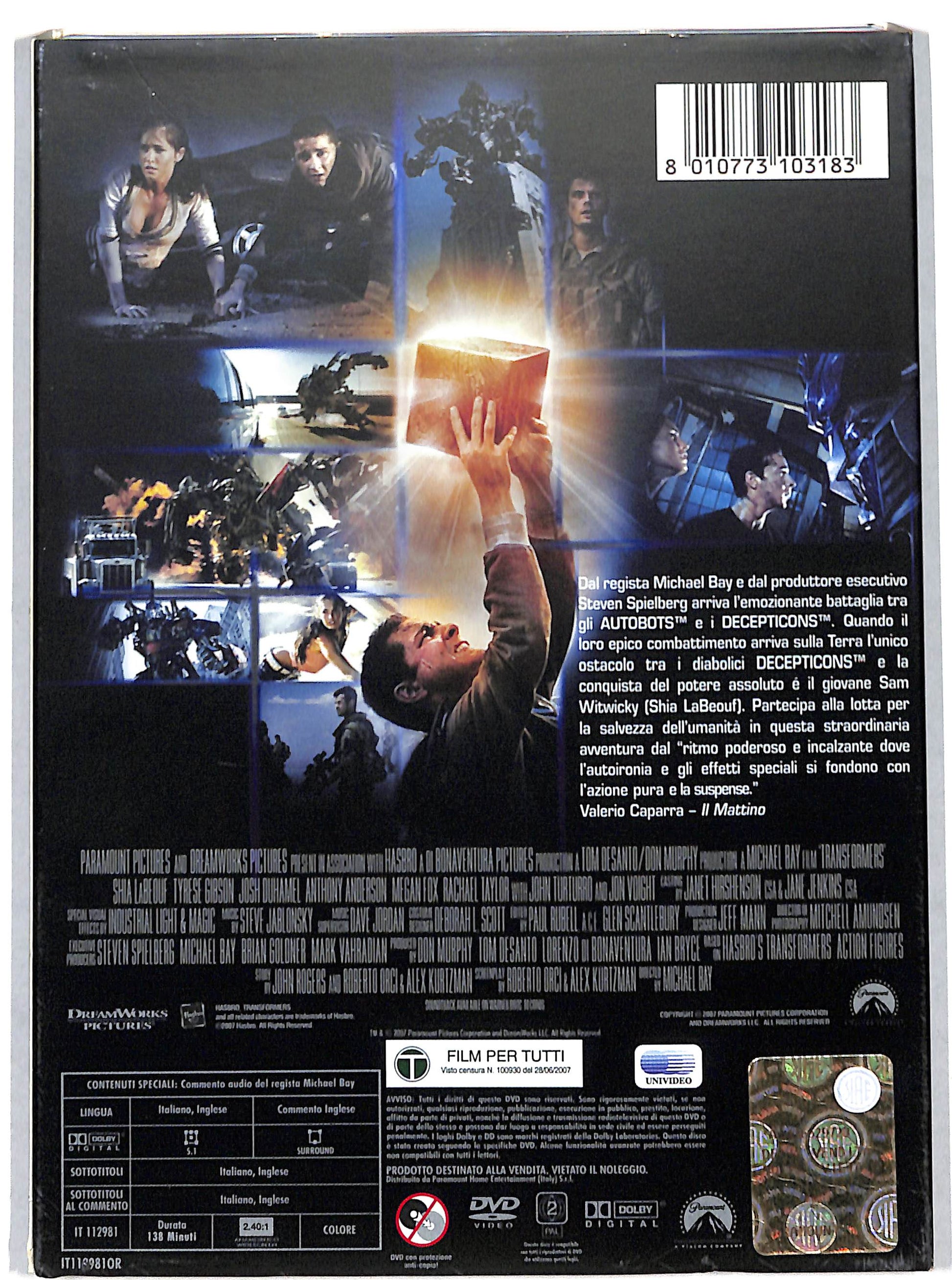 Specifiche: TitoloTransformersCastJohn Voight, John Turturro, Josh Duhamel, Shia LaBeouf, Megan Fox, Anthony Anderson, Sophie Bobal, Charlie Bodin, Bernie Mac, Peter Cullen, Mark Ryan, Darius Mccrary, Hugo Weaving, Robert Foxworth, Reno Wilson, Odette Yustman, Charles Adler, Jess Harnell, Jimmie WoodRegiaMichael BayTramaDiecimila anni fa un cubo alieno precipita sulla terra e un essere meccanico lo segue, rimanendo imprigionato nel ghiaccio