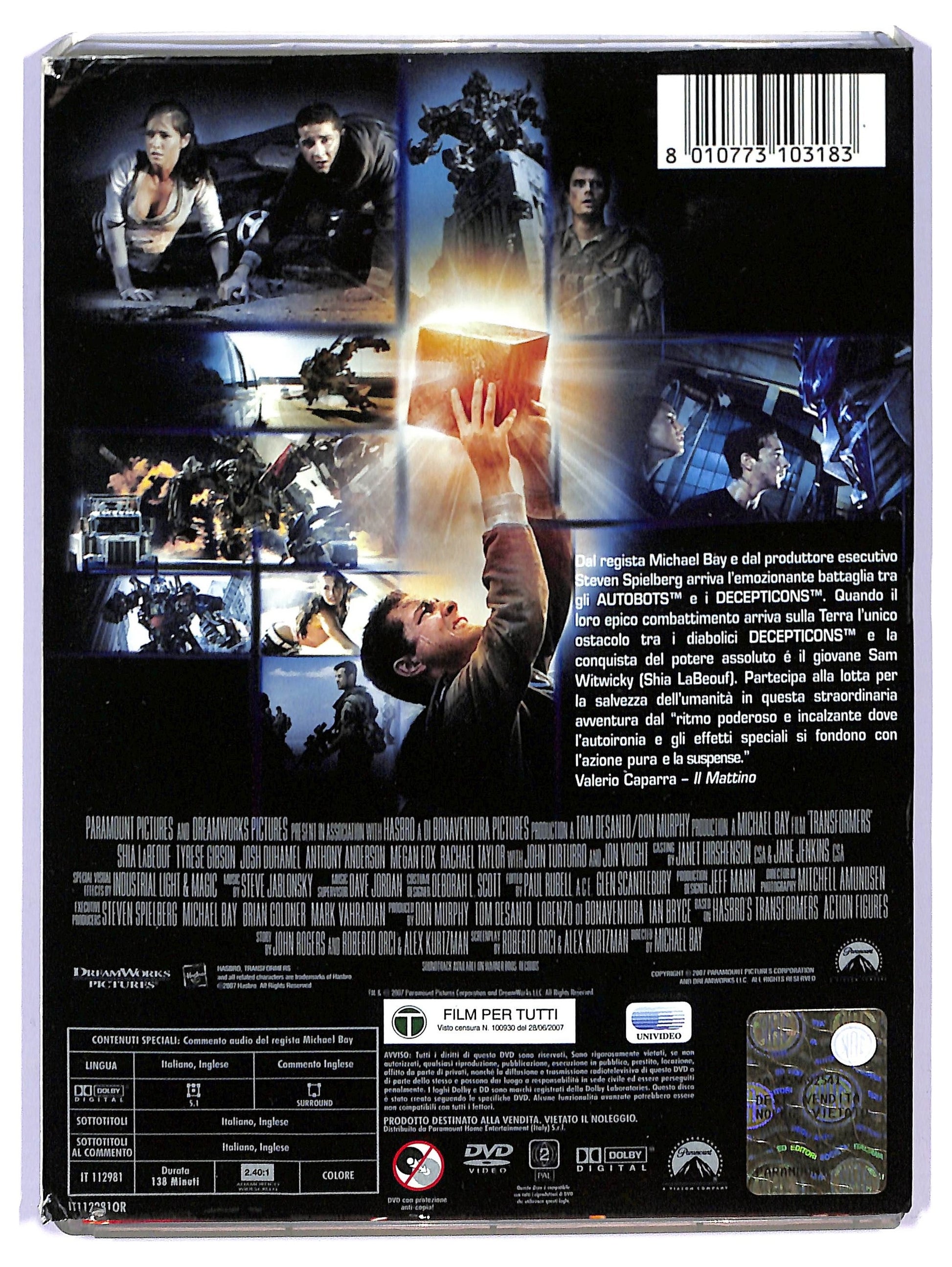 - 2007Durata138Vietato ai minoriVisione adatta a tuttiArea DVDArea 2Formato Video2.40:1ExtraDVDTitolo originaleTransformersNumero dischi1